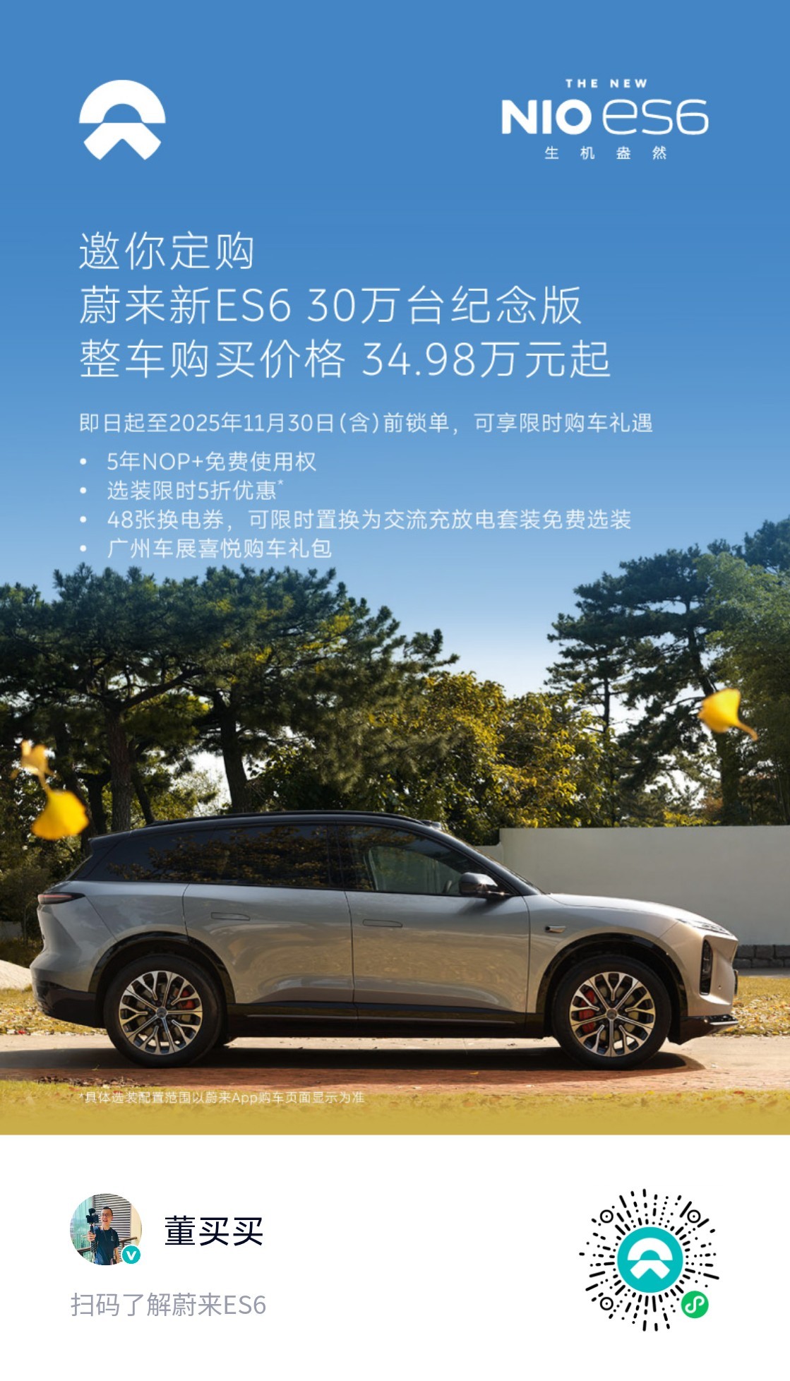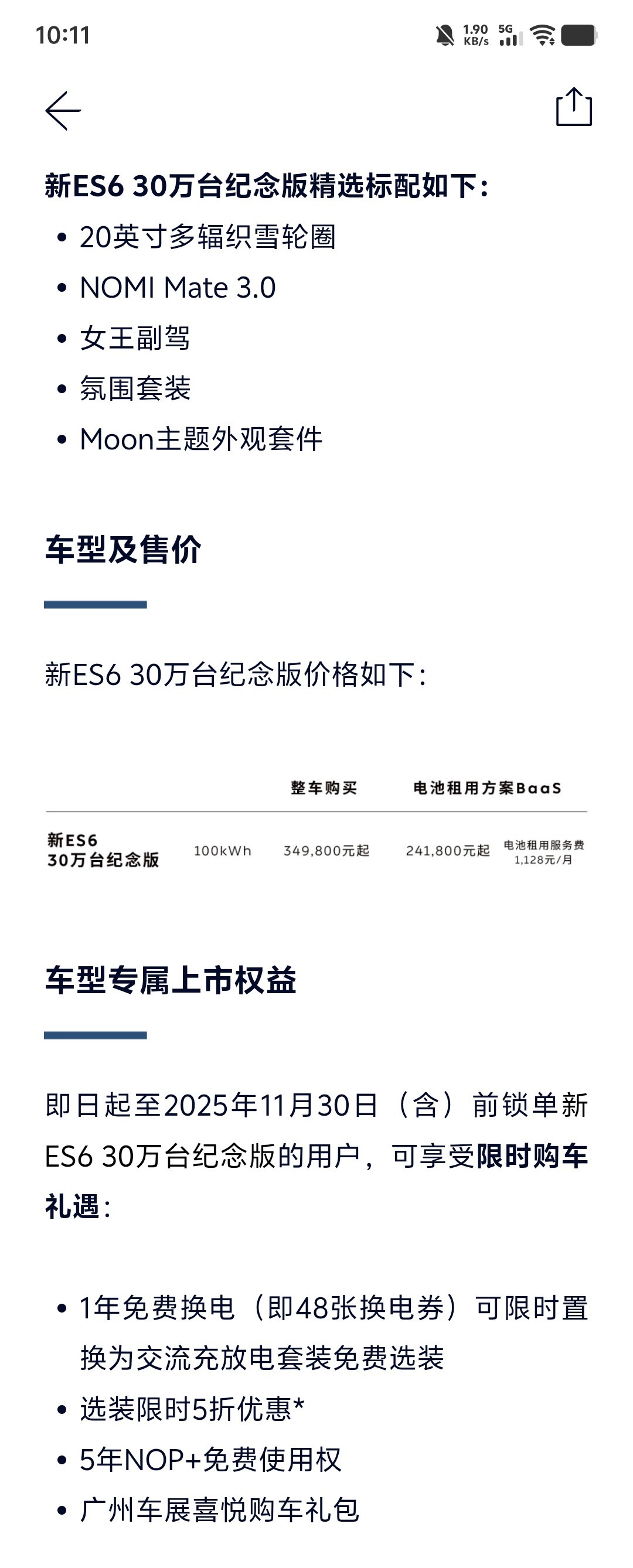 ES6 30万台纪念版,价格从33.8提升到34.98。包含织雪轮毂、NOMI、Moon、女王副驾、氛围套装(照地灯那些)。跟所有纪念版一样,打包价格相比于单选,物超所值。