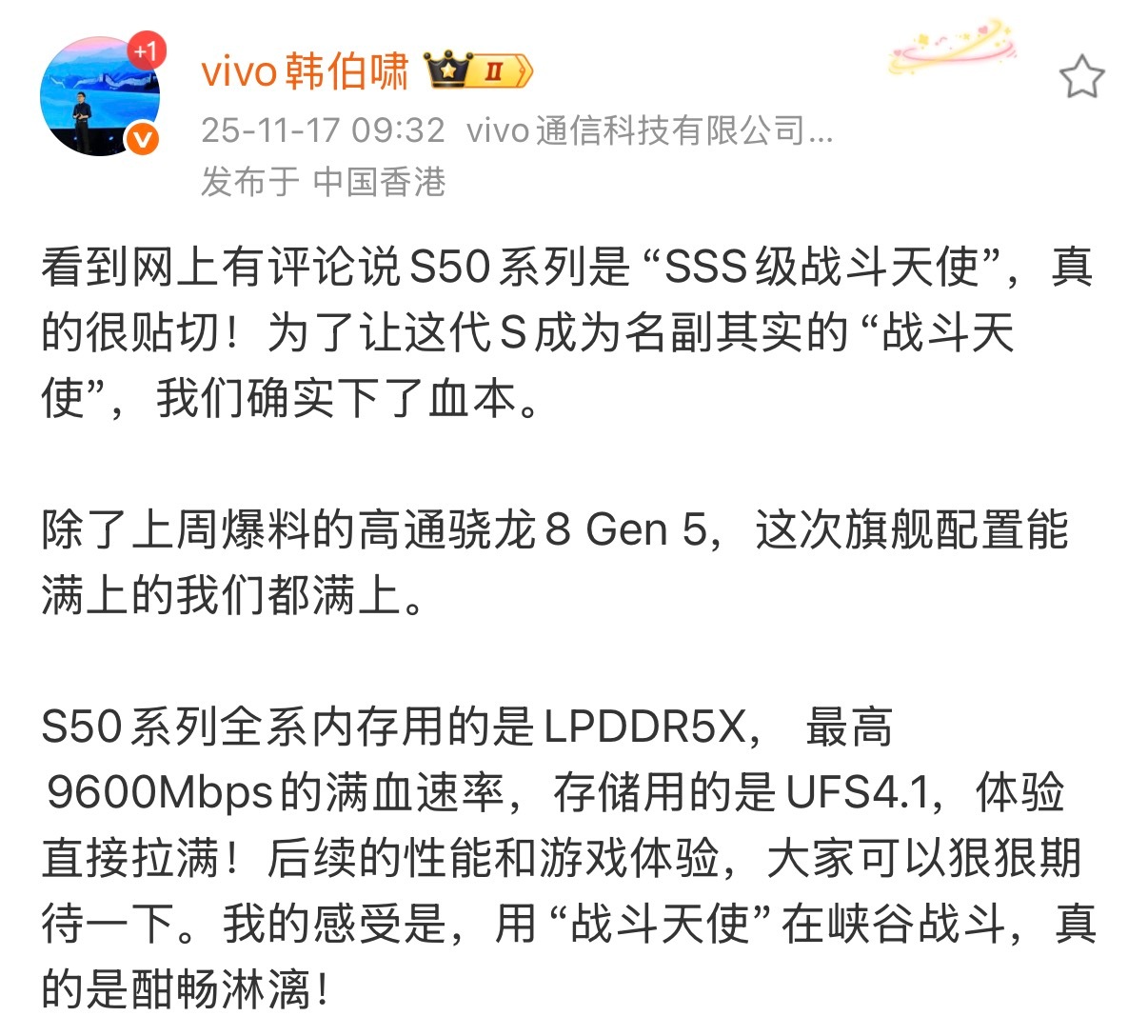 S50系列这性能配置让很多旗舰都很尴尬,最新骁龙8 Gen5+LPDDR5X+UFS 4.1,最高9600Mbps,同档唯一旗舰级潜望镜+超声波指纹,还有双扬和X轴马达,S50系列这堆料让人感觉很陌生,怪不得叫战斗天使