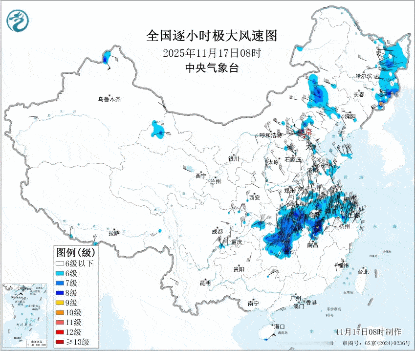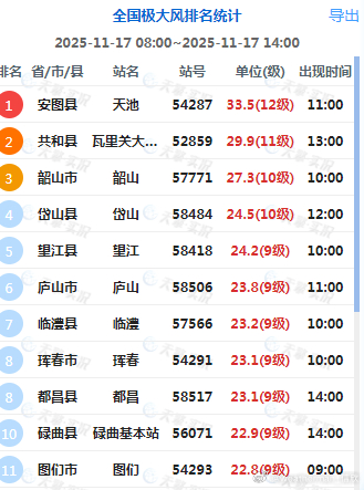 【大风】今天从实况形势场看,我国大部地区处于寒潮的冷高压控制下,在高压前部,气压梯度大,也就是等压线很密集,导致东北华北以及江淮江南等地出现6级以上阵风。对于安徽湖北湖南江西等地来说,如此大的风,不多见。08-14时阵风:吉林天池12级、青海瓦里关11级、湖南韶山10级(27.3米/秒,9-10时),韶山打破当地11月阵风纪录。