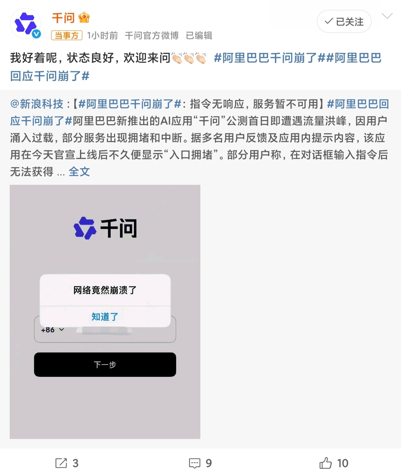 说实话,我不太相信,可能是个别人的网络问题,毕竟背后是阿里云呀,但是也不能说没有这个可能性,瞬间涌入海量的访问,被挤爆是甜蜜的烦恼。电商时代传统电商的地位很稳固,短视频时代电商转向了带货直播。Ai最近两年特别火,反正我写文案,修图都会用到Ai,特别好用,Ai已经成为了新的流量入口。阿里做B端业务的基因还是很强的,C端缺乏流量入口,但是机会永远都存在,而且Ai在目前的中国互联网公司中,阿里应该是最强的吧?所以它是最有可能再次塑造一个超级APP的。