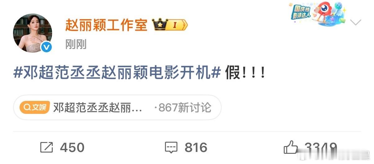 赵丽颖工作室发文否认电影《第十七条》开机!