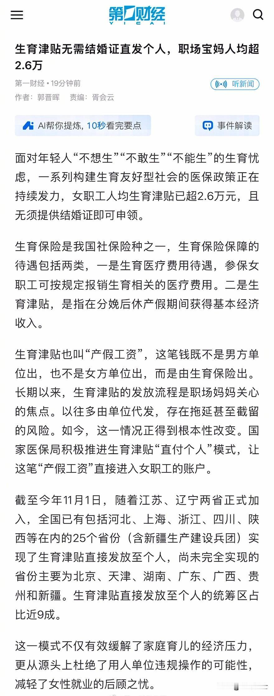 生育津贴无需结婚证直发个人?职场宝妈人均生育补贴超 2.6 万?随着我国生育率的严重下降,各种政策纷至沓来,可是欲速则不达的道理在政策上也一样适用,无需结婚证直发宝妈个人这虽然对每个宝妈是友好的措施,但是这样做是否会变相鼓励婚外情生育等不符合传统家庭伦理的行为。是否也会误导一些男性对生育问题的轻视促进“甩手掌柜”的养成等等这些都可能发生。所以生育津贴要发,但并不能完全不管不顾的乱发,要考虑发了之后的影响。对此你怎么看?生育津贴工资 生孩补贴政策 生育补贴 生育津贴计算 国家生娃补贴 三孩生育补助 生育津贴差额