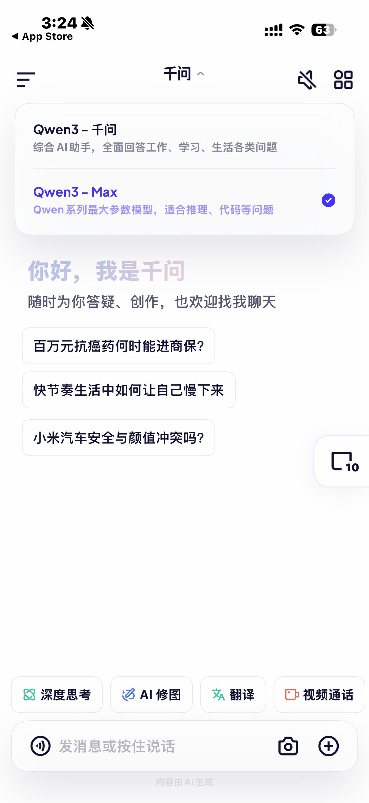 阿里再一次发力了?今天疯狂营销千问 App 。这玩意儿,从一开始的「通义千问」,改名成「通义」,这又改成了「千问」,可劲儿改啊。一个改名,把版本号从 3.6 直接跨越到 5.0,说是用上了在国外屠榜的Qwen3系列模型。现在打开千问 App ,默认用的已经是他们家最新的Qwen3模型了。官方说这玩意儿是他们现在开源的最强模型,我捣鼓了两句,感觉回答问题确实比老版本精准点,可能真不是吹的。如果觉得效果还是不满意,还能切换成 Qwen3-Max 模型,这个没有开源,是目前通义千问系列里最强大的语言模型。简单来说,Qwen3 相当于是大杯,Qwen3-Max 相当于是超大杯。