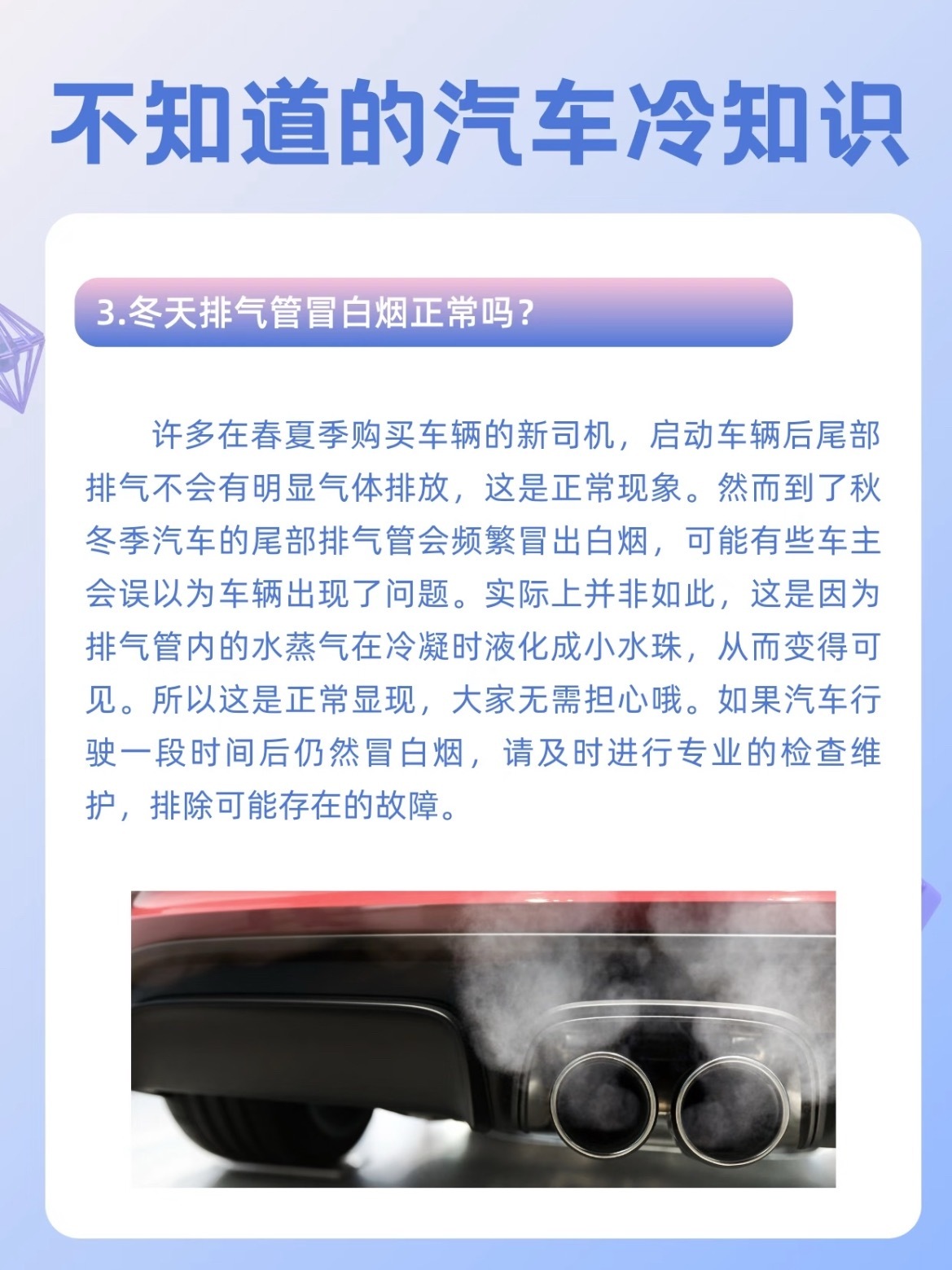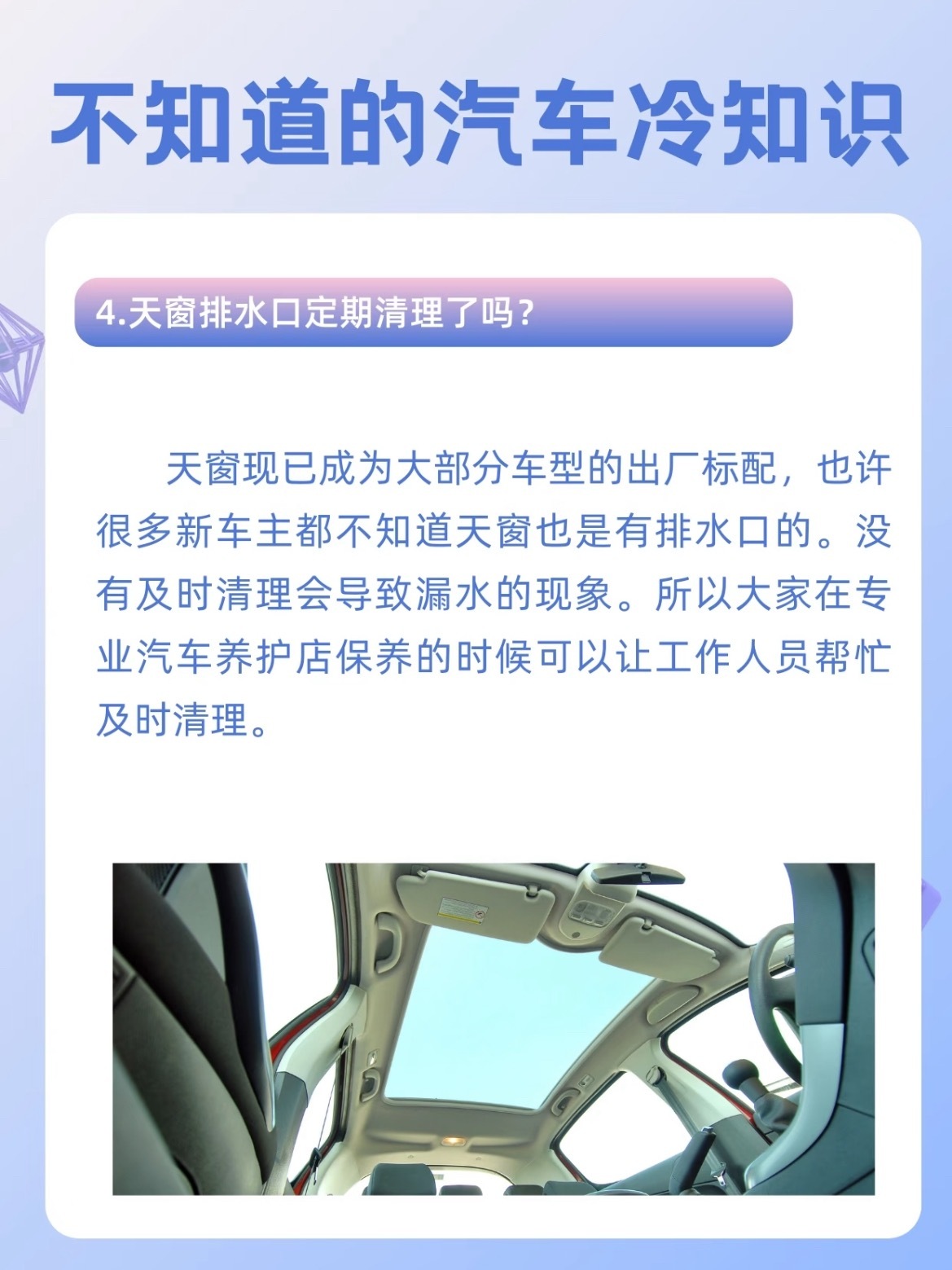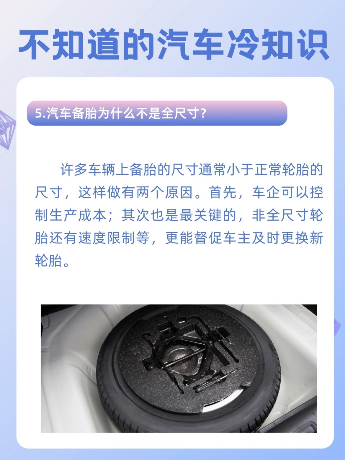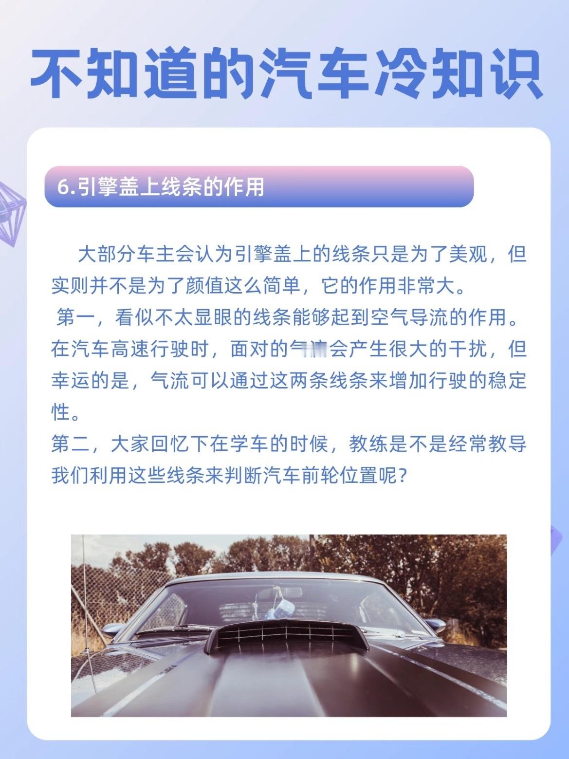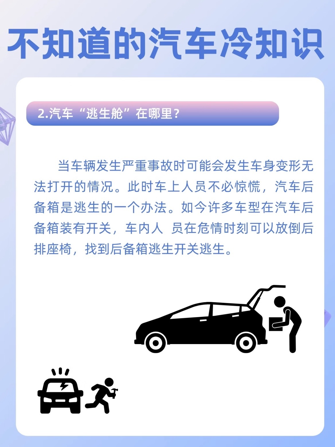 🚗冷知识警报!这6个汽车秘密,老司机也未必全知道!谁说开车多年就算懂车?这些隐藏的汽车冷知识,分分钟刷新你的认知!1️⃣ 安全气囊也有保质期!过期不换?可能该弹时不弹,不该弹时乱弹!2️⃣ 后备箱竟是"逃生舱"车祸门打不开?快爬后备箱!这个小开关能救命3️⃣ 冬天冒白烟反而正常?别慌!那是水蒸气液化,但一直冒就要去检修了4️⃣ 天窗不清理会漏水?排水口堵塞的痛,谁经历谁知道...5️⃣ 备胎为啥总是小一号?不是为了省钱!是逼你尽快换回正常胎6️⃣ 引擎盖线条不只是颜值担当既能导流稳车身,又能帮你看准车轮位置!……