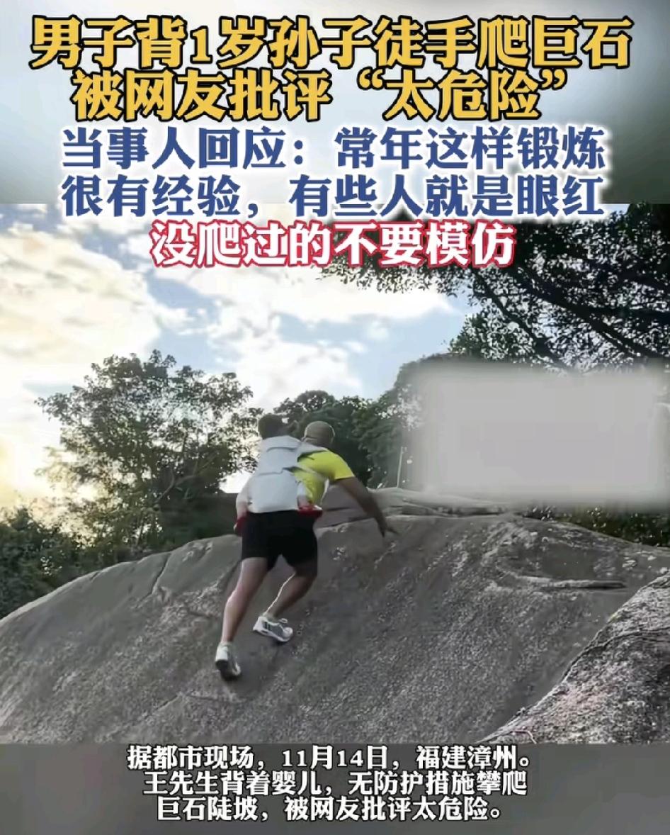 福建漳州,一男子背着一岁多的婴儿攀爬巨石,没有任何的防护措施,网友们觉得太危险了。当事人对此回应,觉得别人是眼红他有这么好的户外能力。这次一定是攀爬巨石有多年的经验。至于为什么背着孩子这样爬,确实是想锻炼他们的户外能力。外人看着这样的动作实在是惊险,如果当事人都不愿意听从提醒的话,那大家也只能袖手旁观了。