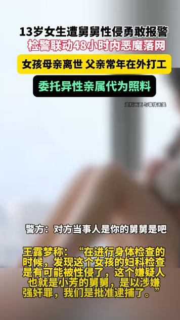 北京,13岁的女孩在听了防性侵安全课后,突然提出想报警,说自己被性侵。工作人员后来得知,侵害她的是舅舅,事情发生在家里。女孩的母亲已经离世,爸爸常年在外务工,女孩交由舅舅帮忙看管。女孩听了安全课后,勇敢地揭发了舅舅的行为。 女孩的身世本来就够让人揪心的,母亲早逝,父亲为了撑起这个家,不得不常年在外务工,一年到头也回不了几次家。没办法,父亲只能把她托付给舅舅照料,想着都是至亲,舅舅肯定会好好照顾外甥女。 起初舅舅确实扮演着合格监护人的角色,会给女孩做饭、督促她写作业,外人看着,这就是个靠谱的亲戚,父亲也以为把孩子交给舅舅,自己就能在外安心赚钱了。可谁也没想到,这个看似可靠的“保护伞”,背地里却藏着一颗恶魔的心。 自从女孩住进舅舅家,两人长期独处,舅舅慢慢暴露了真面目。他利用自己“监护人”的身份,趁着家里没有其他人,对女孩实施了性侵害。更让人发指的是,他还在精神上控制女孩,威胁她说,如果敢把这件事说出去,就再也没人管她了,让她变成无依无靠的孤儿。对于一个失去母亲、父亲远在天边的孩子来说,“被抛弃”的恐惧比什么都可怕。 女孩心里又害怕又痛苦,却只能把所有秘密咽进肚子里,在同一个屋檐下,对着这个伤害自己的人强装平静,日子过得煎熬又绝望。 这样的日子持续了一段时间,直到学校组织了一场由妇联牵头、北京市房山区检察院检察官助理主讲的防性侵安全教育课。 课堂上,老师详细讲解了什么是性侵害、遇到这种情况该怎么办,还告诉孩子们,遇到伤害不是自己的错,一定要勇敢求助、及时报警。这些话像一束光,照亮了女孩黑暗的世界,她终于明白,自己经历的那些可怕的事,不是“家事”,而是犯罪,而她也不是孤立无援的。 就在课堂接近尾声,老师询问大家有没有疑问或需要帮助时,女孩犹豫了很久,终于颤抖着举起了手,她的手还在微微发抖,眼神里带着恐惧,却透着一股前所未有的坚定,当众说出了自己想要报警的意愿。 这个勇敢的举动,让在场的老师和工作人员都愣住了,大家立刻意识到,这个女孩可能遭遇了不寻常的伤害。 课堂没有草草结束,检察官助理王露梦和工作人员赶紧把女孩带到单独的房间,温柔地安抚她的情绪,耐心地听她讲述事情的经过。 当女孩断断续续说出伤害自己的人竟然是平时照顾她的舅舅时,在场的人都感到无比震惊和愤怒。女孩一边说一边哭,把心里积压已久的恐惧、委屈和痛苦全都宣泄了出来。 工作人员心疼地安慰她,告诉她做得很对,勇敢说出来就是保护自己的第一步,还立刻帮她联系了警方。 学校、警方、检察院很快联动起来,一张保护女孩的安全网迅速张开。警方第一时间介入调查,去女孩的住所和舅舅的工作单位搜集证据,同时带女孩去医院做了妇科检查,检查结果也成为了指控舅舅犯罪的重要医学证据。 按照法律规定,女孩不满14周岁,无论她是否反抗,舅舅的行为都已经构成了强奸罪,而且他作为负有监护、看护职责的特殊人员,这种利用信任实施犯罪的行为,性质更加恶劣,会受到更严厉的处罚。 女孩的父亲接到消息后,立刻从外地赶了回来,看到女儿受了这么大的委屈,心里又疼又悔,紧紧抱着女儿,一个劲地说“爸爸来晚了”。 父亲的陪伴,给了女孩很大的安慰,让她知道自己不是没人管的孩子。而当女孩听到舅舅被警方逮捕的消息时,紧绷了很久的身体终于松弛下来,肩膀也不再僵硬,那种如释重负的感觉,是法律给她的第一重疗愈。 这也提醒我们,对于那些父母不在身边、由亲属照料的孩子,不仅要建立可靠的监护关系,更要加强对他们的安全教育,让他们知道遇到伤害时该如何保护自己。同时,家庭、学校、社会也应该形成合力,加强对委托监护的监督,不给坏人可乘之机。 舅舅本应是女孩的依靠,却利用信任伤害了她,这种背叛比陌生人的伤害更让人难以承受。但好在,女孩最终勇敢地站了出来,法律也给了她公正的回应。希望这个女孩在家人的陪伴和社会的关爱下,能够慢慢走出阴影,重新拥抱阳光;也希望所有的孩子都能在安全的环境中长大,远离伤害,而那些伤害孩子的恶魔,都能受到应有的惩罚。 (信息来源:江西文旅广播 )
