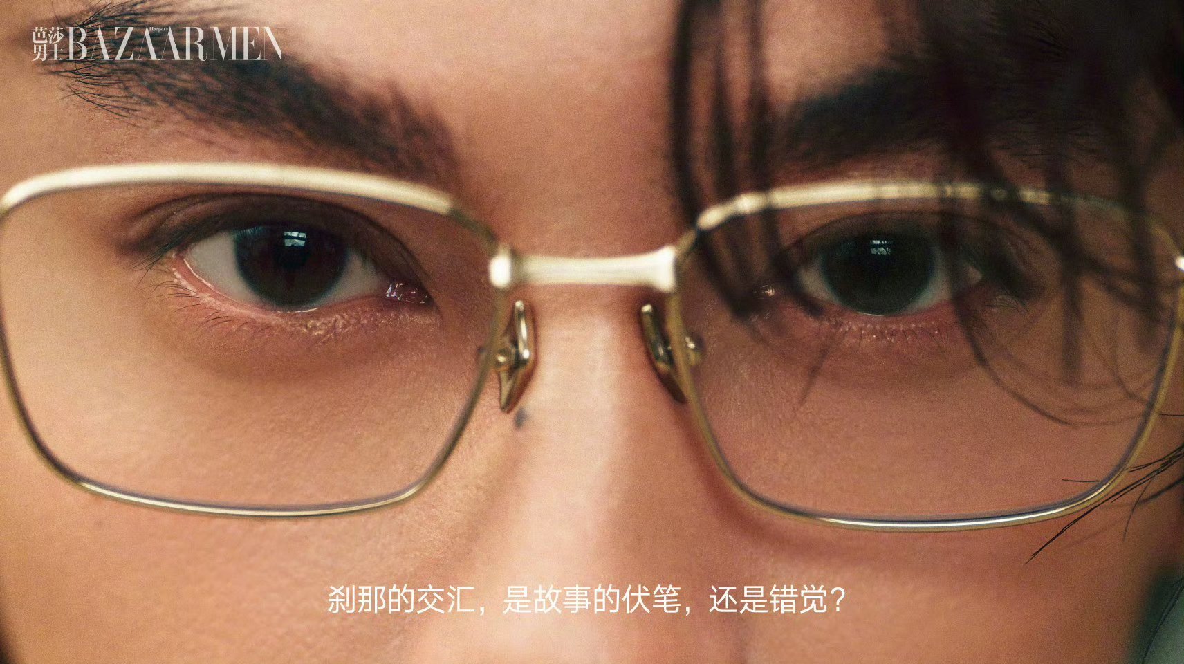 看田栩宁的特写,眼镜加持下的他多了份沉稳锐利,宛如“眼镜鲨”般自带压迫感又不失灵动。眼神透过镜片传递出强烈情绪,面部线条的特写更显精致,整体画面张力十足,时尚表现力很突出。