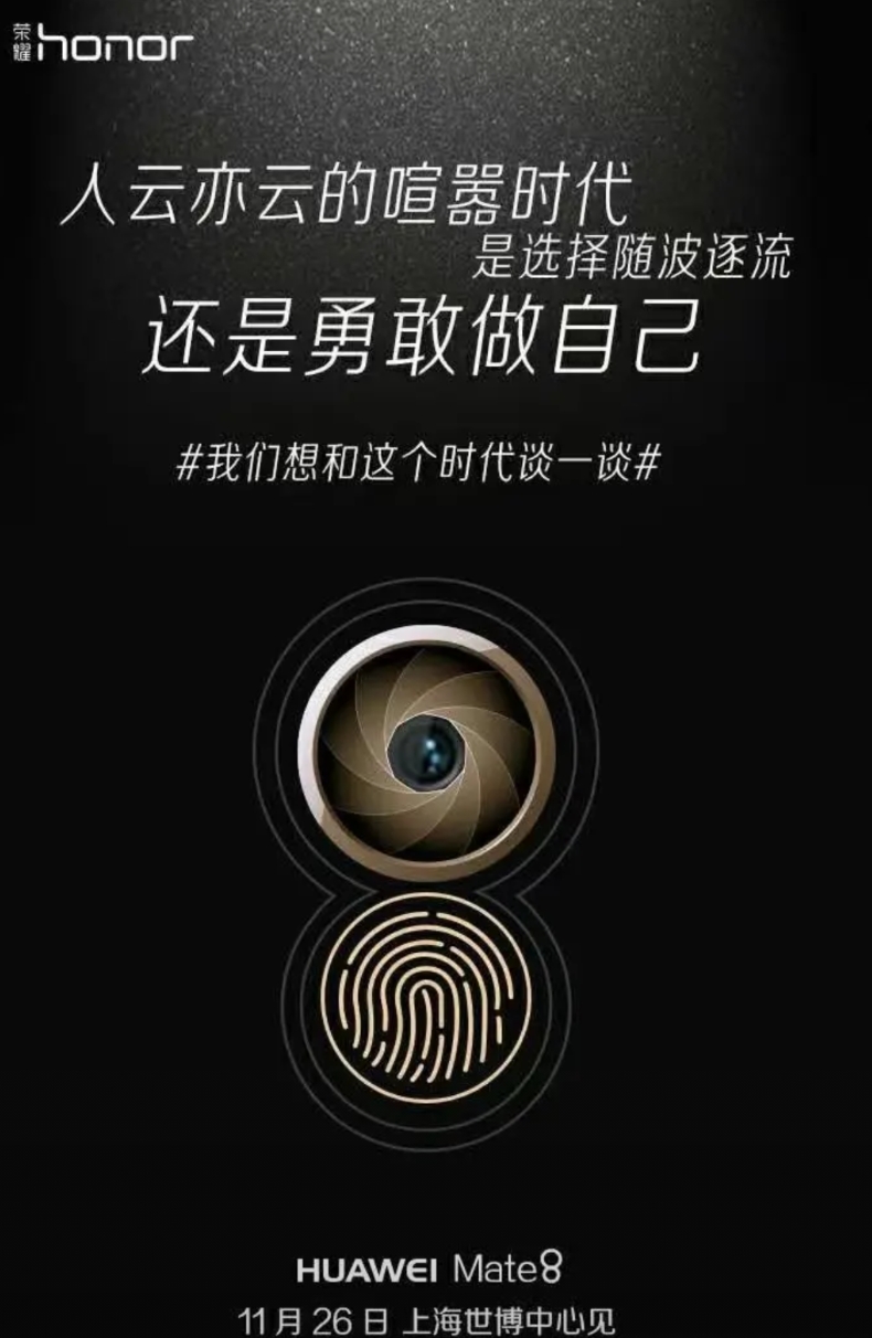 Mate80系列一定程度上也是在致敬曾经的Mate8,那会荣耀(没分家)发了以如下图的海报。文案是:“人云亦云的喧嚣时代,是选择随波逐流,还是勇敢做自己,我们想和这个时代谈一谈”!