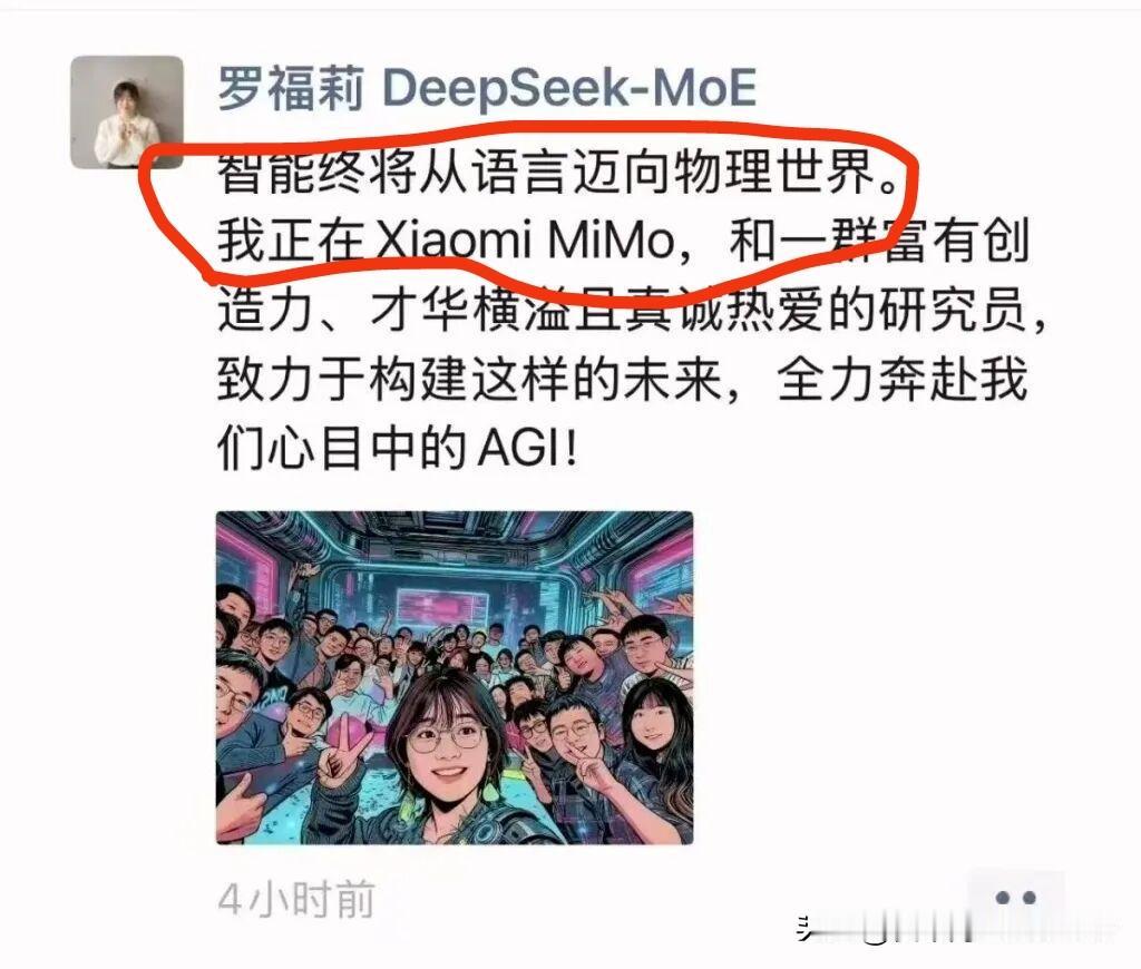 前DeepSeek研究员罗福莉在朋友圈里正式宣布加入小米,将致力于领导AGI(通用人工智能)研发。 她说的“智能终将从语言迈向物理世界”,意思是不是人工智能将从“语言世界”迈向“现实世界”啊?我现在已经会用AI解答问题、写总结、生成需要图片啦,将来是不是很快就能让“人工智能”给我做饭、洗衣服、打扫卫生啦?如果这样那就太好了,终于不用洗衣做饭啦,终于不用和先生商量拖地、打扫卫生啦。可是我空下来的时间干嘛啊?看来我得好好琢磨琢磨啦。😁 (图片来自网络)
