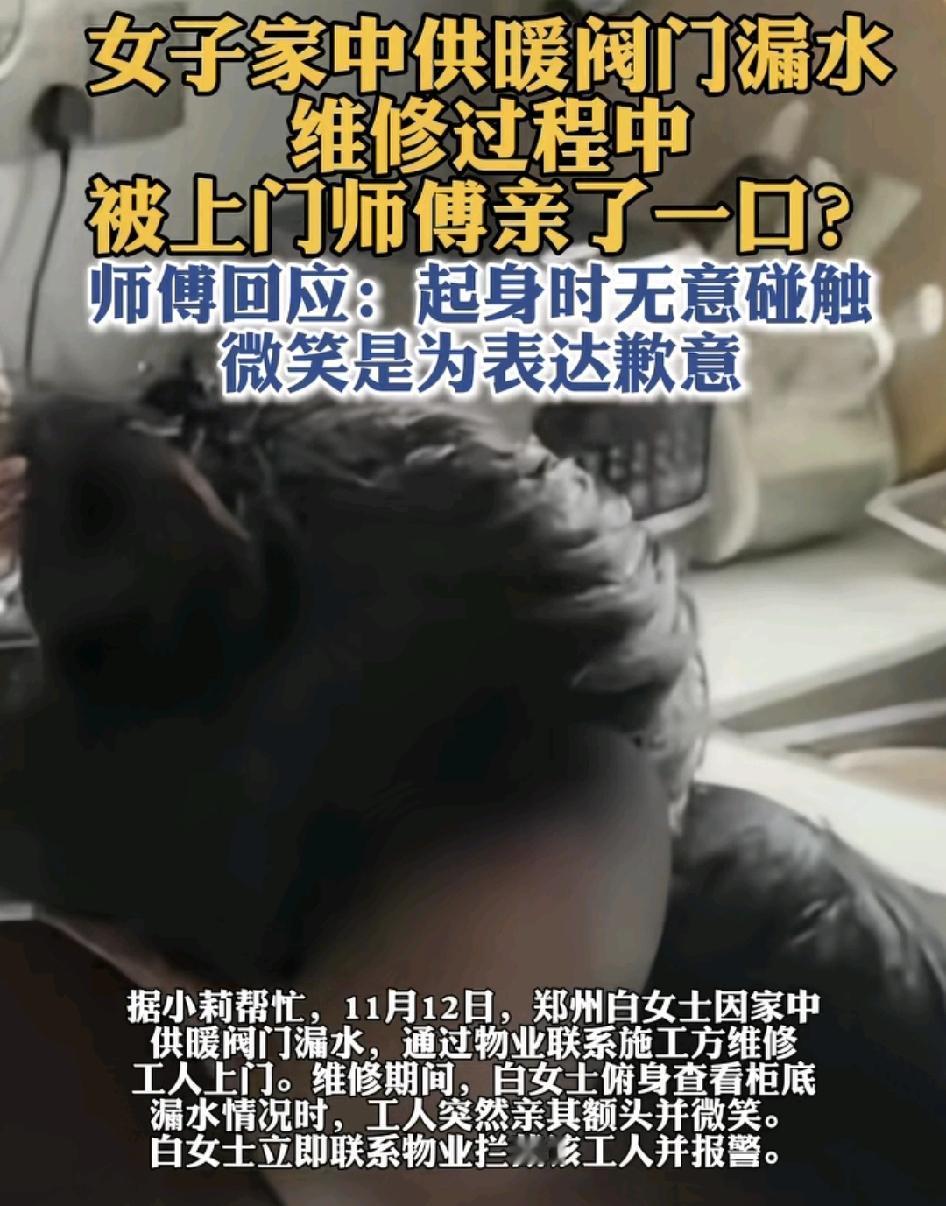 郑州一女士家中供暖阀门漏水,联系物业,要求施工方上门维修,实施工人在维修过程中,女子蹲下查看漏水情况时,没想到对方起身亲吻自己的额头,女子立即联系物业并阻拦对方的行为。但时隔多日,物业与施工方都没有对此有一个合理的解释,施工方当时表示,自己也是在维修过程中无意间碰到对方的额头,自己微笑是表示歉意的意思,物业回应,这事情只能通过调解也配合调查。大家都觉得施工方有问题,正常来说这种情况大家都会避嫌,更加提醒女性单独在家要注意人身安全。
