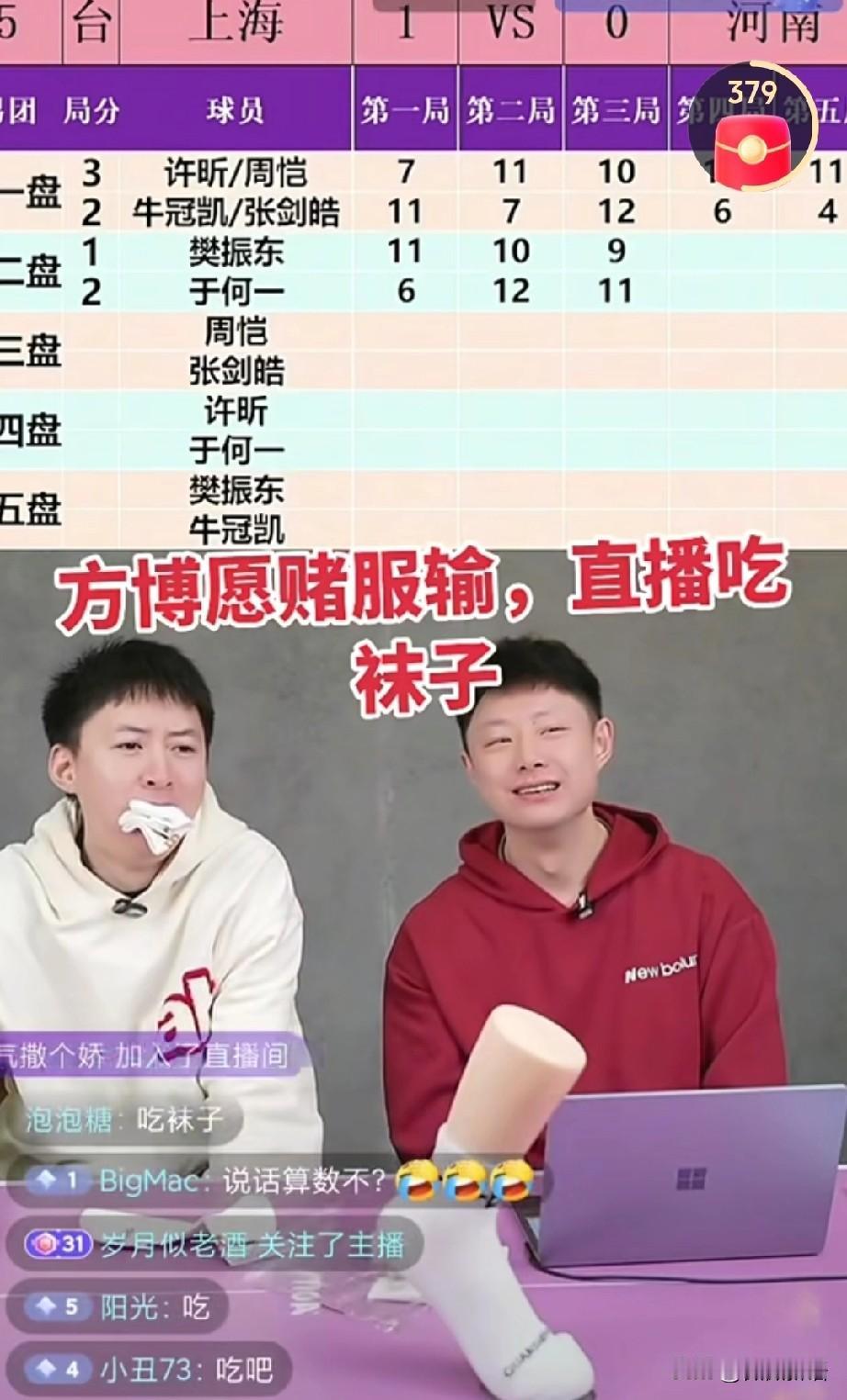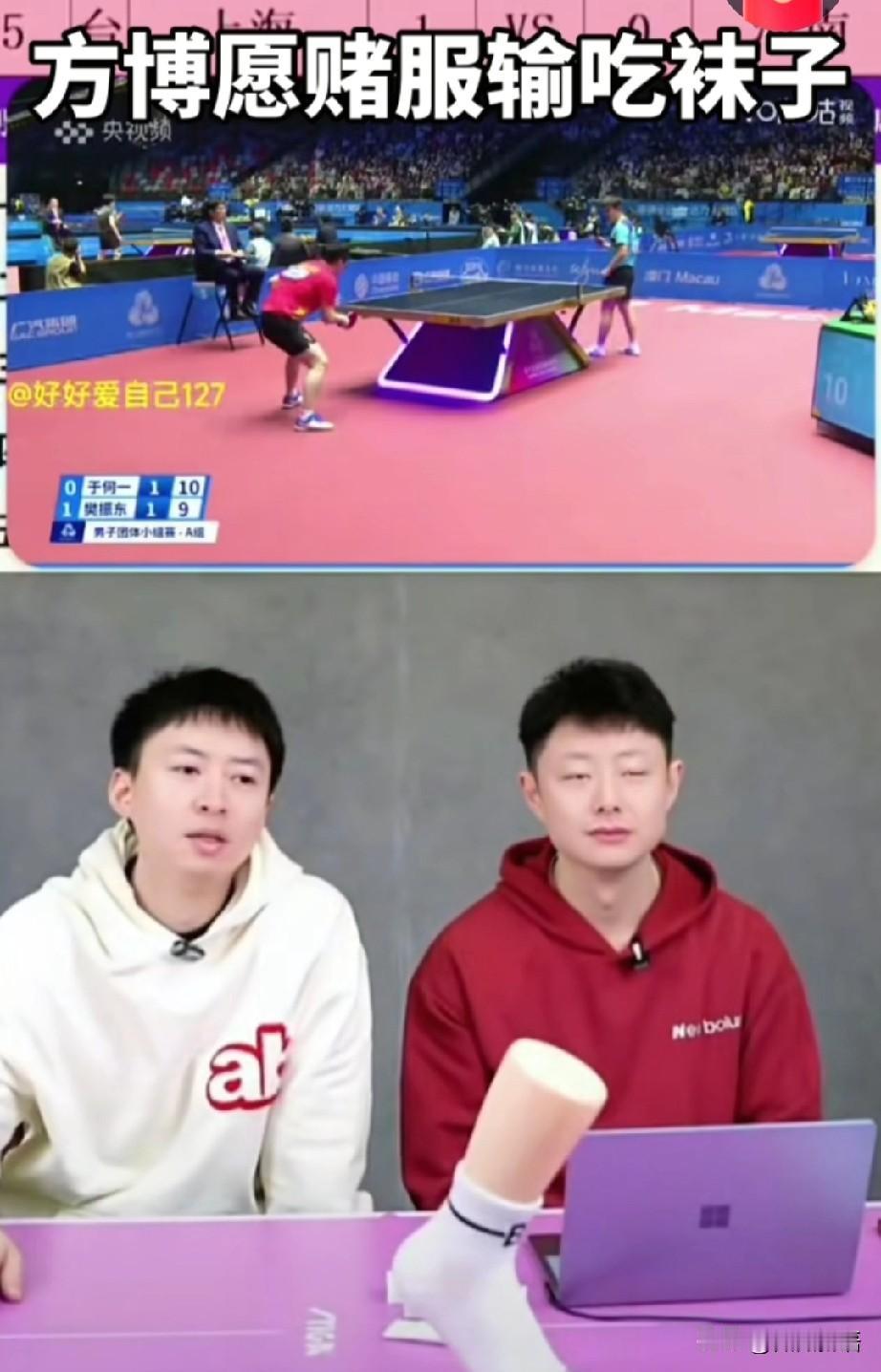 方博又开始直播比赛了。 今天中午的团体赛,方博直播说于何一和樊振东打比赛,如果于何一能赢两局他把袜子吃了,没想到于何一一第三局结束的时候就已经赢了两局,方博也是愿赌服输,在直播间里吃起了袜子,又网友是:“方博不仅卖袜子,还吃袜子”。 方博和于何一的关系也不错,男单比赛开始的时候,于何一首轮对阵梁靖崑,方博还给于何一支招了,不知道用上没有,不过于何一是赢了梁靖崑的。 于何一这个孩子也情商高,每次采访说的也很好。全运会乒乓球男子团体小组赛A组,上海队3-0战胜河南队,樊振东3-2于何一,于何一赛后接受采访表示:“结果已经证明了一切,樊振东的实力无需我评价。”虽然于何一退出国家队,但是他也一直在打比赛,球打的也不错,而且退队后他也早早的成家了,挺好的。