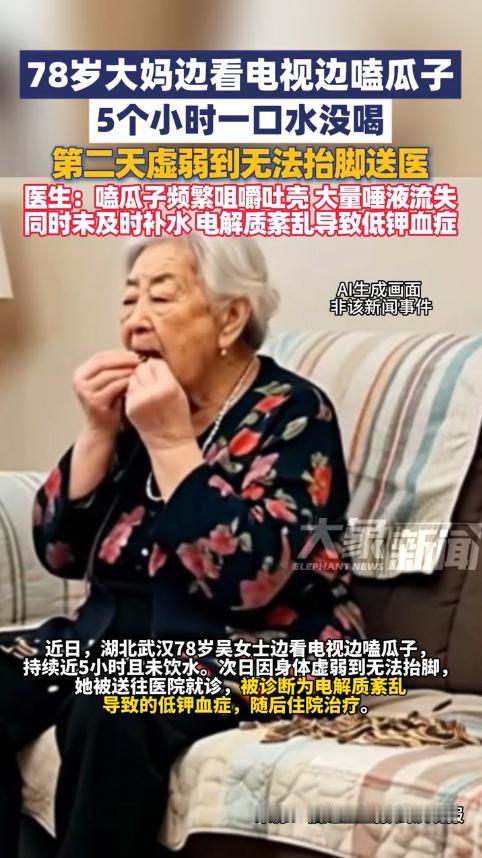 “悲剧还是发生了!”近日,湖北武汉,一78岁老太边看电视边嗑瓜子,5个小时都没有喝水,结果第二天身体异常虚弱,连脚都抬不起来!家人见状急忙将她送去医院,被诊断为低钾血症,原因是唾沫吐多了。网友:什么瓜子这么好吃? 吴老太平时就喜欢嗑瓜子,尤其是晚上看电视的时候,总爱抓一把瓜子在手里,边看边嗑,觉得这样既解闷又惬意。 那天晚上,她从晚饭过后就坐在沙发上看电视,面前摆着一大盘瓜子,越嗑越上瘾,不知不觉就从傍晚嗑到了深夜,整整5个小时,眼睛盯着电视屏幕,手里的瓜子就没停过,期间连一口水都没顾上喝。 第二天一早,吴老太想起床做饭,可刚一翻身就觉得浑身没力气,双腿软绵绵的,试着抬脚的时候,发现根本用不上劲,差点从床上摔下来。她想喊家人帮忙,却发现声音都有点发虚,家人听到动静赶来,看到她虚弱的样子,吓得赶紧拨打了120,把她紧急送往医院。 医生给吴老太做了全面检查,抽血结果显示她的血钾水平严重偏低,确诊为低钾血症。听到诊断结果,吴老太和家人都一头雾水:“好好的怎么会缺钾呢?”医生询问了她前一天的生活习惯,得知她嗑了5个小时瓜子没喝水后,才给出了答案:问题就出在嗑瓜子和不喝水上。 原来这里面藏着一个很多人都不知道的小秘密:我们的唾液其实是“富钾液体”,里面含有的钾离子浓度特别高,差不多是血液里正常钾含量的4到5倍。吴老太连续5个小时不停地嗑瓜子、吐瓜子壳,这个反复咀嚼、吐唾沫的动作,就像启动了一台小“抽水泵”,把体内的钾元素通过唾液源源不断地排了出去。 更关键的是,她全程没喝一口水,没法及时补充体液,体内的电解质平衡一下子就被打破了,血钾水平自然就急剧下降。 医生说,低钾血症最典型的症状就是肌肉无力,吴老太出现的“抬不起脚、浑身发软”,就是身体发出的预警信号。 幸好送医及时,要是再拖下去,情况可能会更严重,钾元素对肌肉收缩、心脏跳动都至关重要,严重缺钾可能会影响到呼吸肌,导致呼吸困难,甚至会出现心律失常,危及生命。 除了肌肉无力,低钾血症还会引发一系列其他问题。比如消化系统会受影响,出现食欲不振、恶心腹胀;有些人还会感到头晕、嘴巴周围和手脚发麻;要是长期缺钾,对心脏和肾脏的损害也很大。很多网友看完科普后都惊出一身冷汗:“原来嗑瓜子这么平常的事,竟然还藏着这么大的风险,以后可不敢这么猛嗑了。” 不过大家也不用过于恐慌,缺钾虽然危险,但只要及时发现、科学补充,就能很快恢复。像吴老太这种轻症,医生建议通过饮食来补钾,比如多吃香蕉、海带、黄豆、蘑菇、瘦肉这些富含钾的食物,安全又有效。但如果是比较严重的低钾,需要用药物补钾时,一定要严格听从医生的指导,不能自己随便买药吃。 因为钾元素就像一把“双刃剑”,补少了会缺钾,补多了又会导致高钾血症,同样危险。高钾血症会抑制心肌功能,让人出现肌肉酸痛、心跳紊乱的症状,严重时甚至可能导致心脏骤停,后果不堪设想。所以无论是补钾还是日常养生,关键都在于“平衡”。 这事儿也给大家提了个醒,日常生活中的一些小习惯,稍不注意就可能影响健康。 比如长时间嗑瓜子、嚼口香糖,或者大量出汗后不及时补水,都可能导致电解质失衡。尤其是老年人,身体的调节能力相对较弱,更要注意这些细节:吃东西要节制,不能因为喜欢就无限制地吃;长时间进行咀嚼类活动时,一定要记得及时喝水;平时饮食要均衡,多吃富含钾、钙等微量元素的食物,少喝酒、少碰那些可能导致钾流失的药物。 网友们的调侃虽然好笑,但背后藏着的健康警示却很重要。一把小小的瓜子,看似普通,却因为“5小时不喝水”的疏忽,让老人遭了罪。 这也告诉我们,健康从来都藏在细节里,懂得节制、保持平衡,关注身体发出的每一个小信号,才能稳稳守护住日常的平安。希望吴老太能早日康复,也希望更多人能从这件事里吸取教训,不再因为一时的惬意而忽视了身体的健康。 信息来源:《边看电视边嗑瓜子,5小时一口水没喝!78岁老人把自己嗑进医院,虚弱到连脚都抬不起来》极目新闻