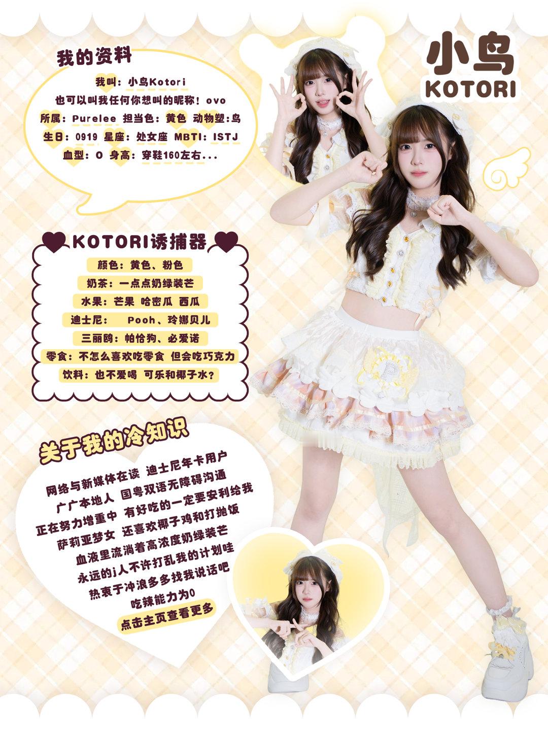 大家好 我是Purelee的黄色小鸟担当小鸟Kotori 💛🐦也可以叫我鸟鸟 (任何你喜欢的昵称都可以哦!)官博指路👉 (行程等信息都在官博)✨9.19 处女座 istj 铁骨铮铮的j人喜欢一切事物按照计划按部就班🙂↕️虽然计划总是被讨厌的不可抗力打破…😡虽然是i人但骨子里流淌着一股淡淡的幽默🤓和我聊天的朋友总是会被我逗笑!哼哼🤫所以不用担心和我聊天会冷场什么的!很喜欢倾听大家日常生活中的故事!同时我也非常期待和大家交换故事哦🧐✨网络与新媒体专业在读……欢迎大家和我交流讨论专业领域的问题(虽然感觉窝学到了0个知识…🤧)✨血液里流淌着高浓度奶绿装芒!😽🥭点门永存!最近还爱喝007酸奶草莓绿!✨广广本地人 粤语国语双语无障碍沟通😎✨喜欢打扮得漂漂亮亮拍好看的照片和手势舞!自封的自拍天才🪽拍照请拍我的黄金左脸和正脸谢谢喵🙂↕️😈最近也在摸索拍出有趣的vlog当中🎬✨今年斥巨资开了迪士尼年卡!所以会突然闪现去迪士尼!誓死效忠Pooh、玲娜贝儿!🍯✨喜欢做一些可爱的小手工!(当年疯狂搜起泡胶教程的人就是我🤨)~同时在努力研究如何画出完美切奇中…🤩和我一起吃饭🍽️👉目前是唱跳菜鸟😭正在努力提升自己!憧憬着成为优秀的偶像!请一起见证我的成长吧!期待跟你展开属于我们之间的故事哦!