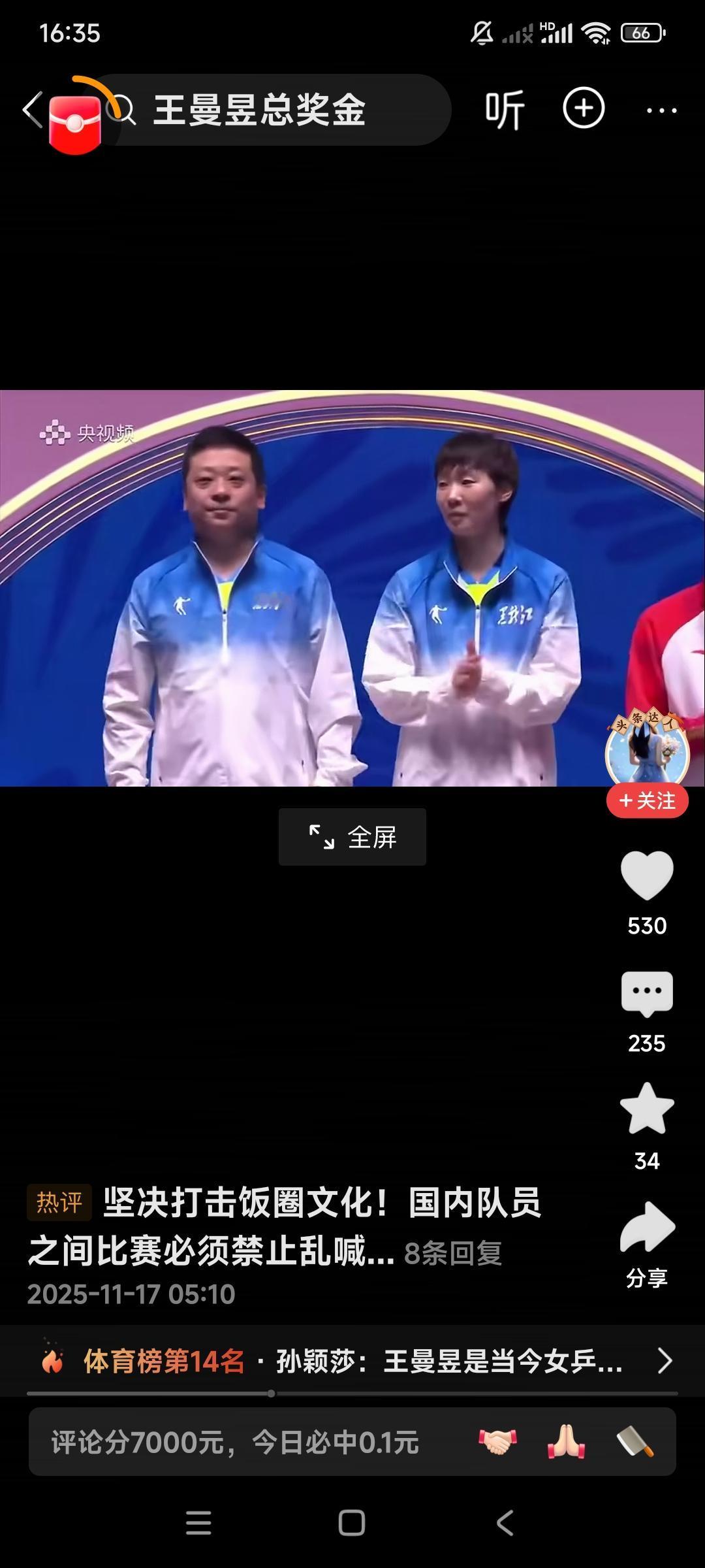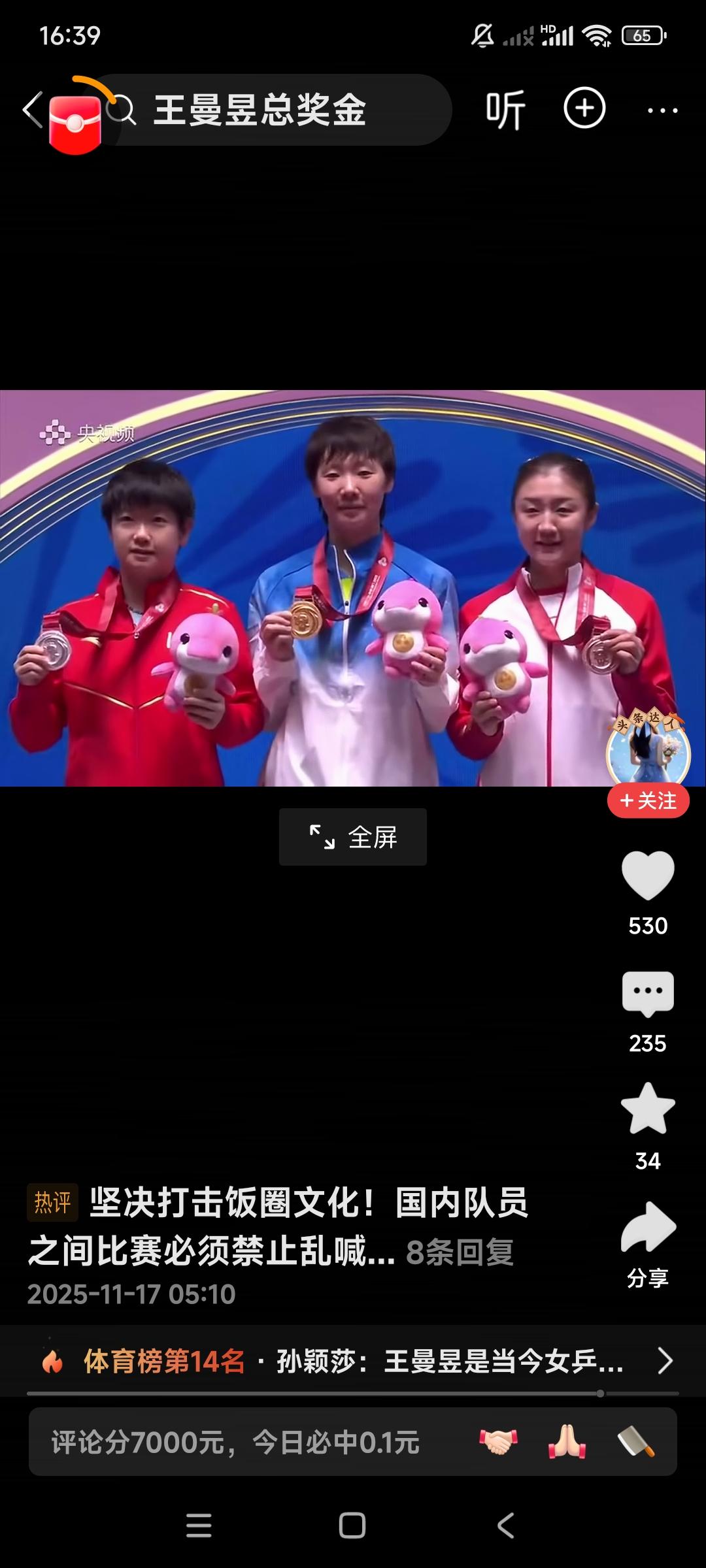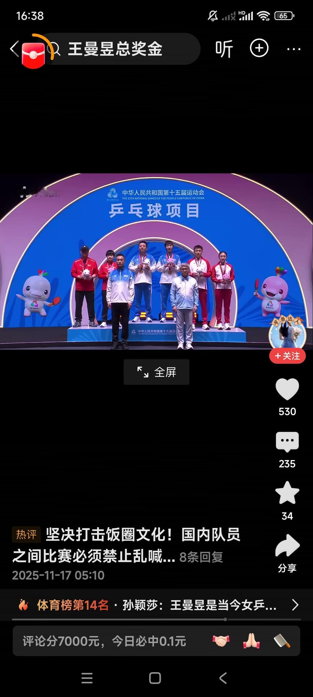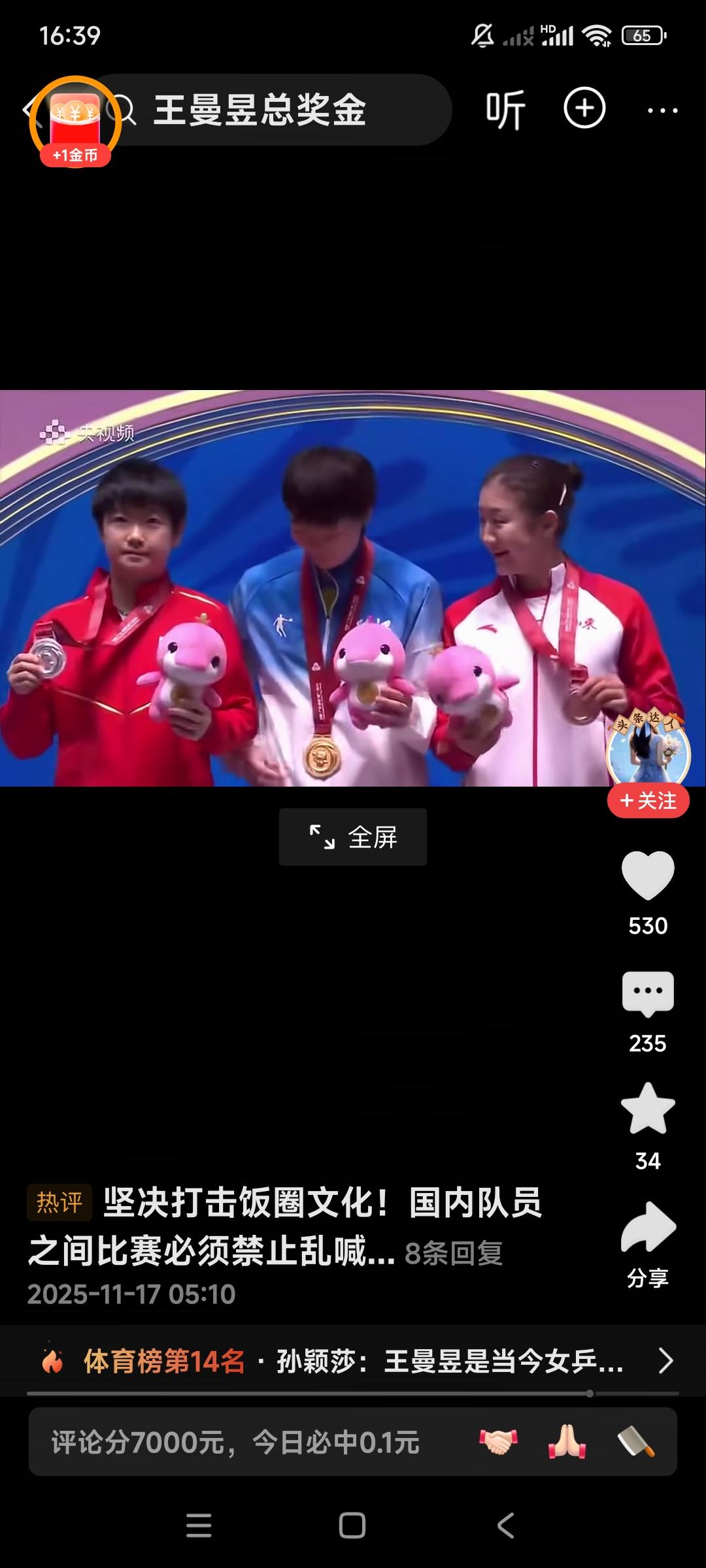 祝贺王曼昱夺得十五届全运会女子单打冠军。 厉害了王曼玉,在最后一局孙颖莎8:2领先的情况下,最后11:9逆转总比分4:2赢下比赛。 夺得这一块宝贵的女单金牌,卫冕成功。