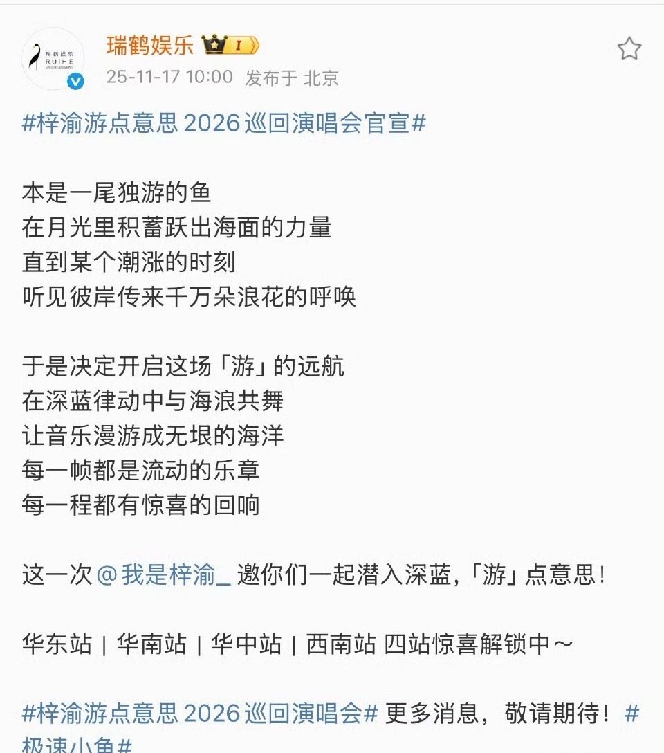 梓渝官宣26年四站巡演,这算不算内娱爆红后最快开演唱会的新人歌手了,承办方还是银
