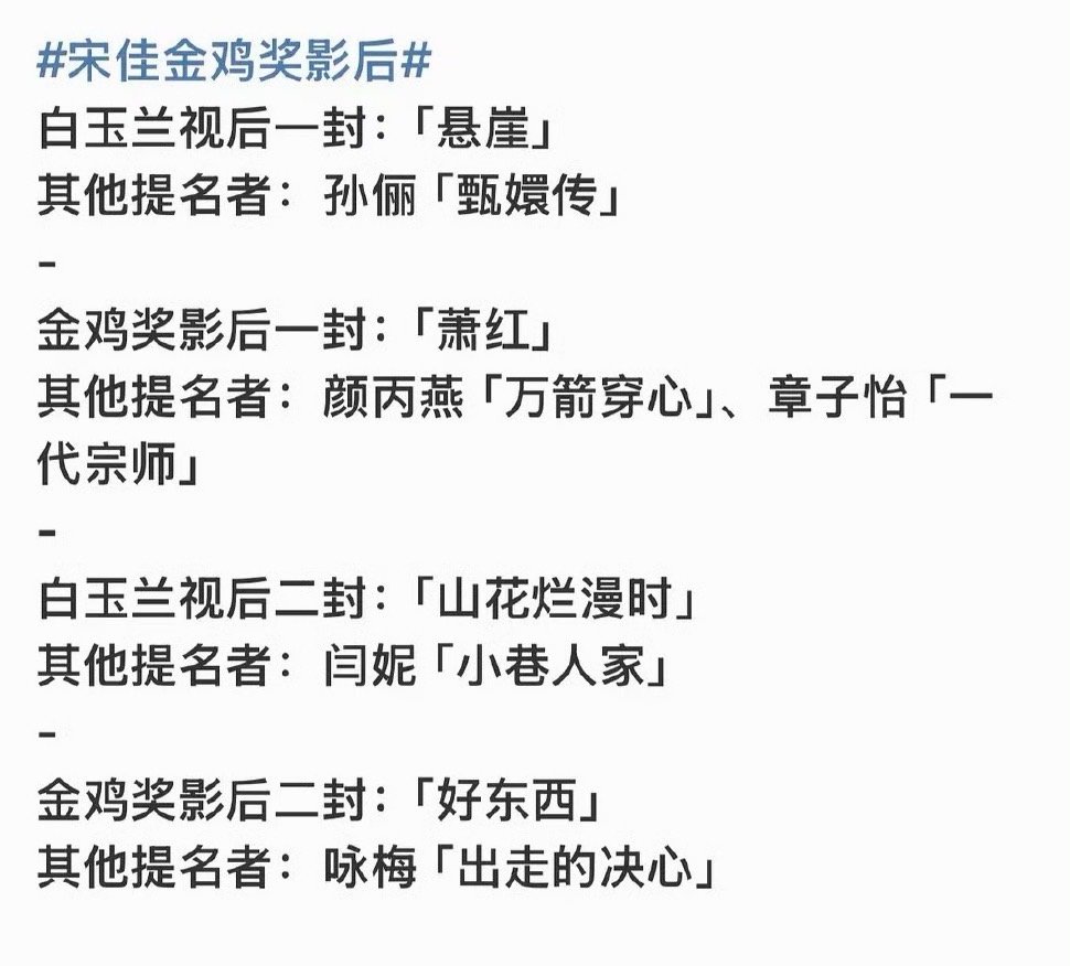 人真的不能贪心,本来这两年宋佳凭借《山花烂漫时》风评不错,结果二封金鸡影后全平台翻车,要知道章子怡《一代宗师》、咏梅《出走的决心》、颜丙燕《万箭穿心》没得奖都说卡二封,结果宋佳靠着《好东西》的演技二封就显得水了,如今张桂梅老师的滤镜也没用了