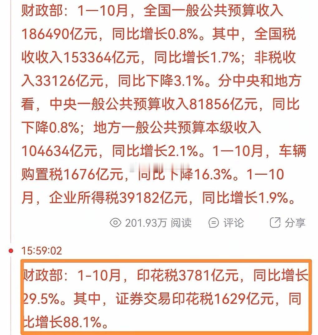 利好消息来了!1-10月证券交易印花税同比增长88%,说明今年投资者人数与投资资