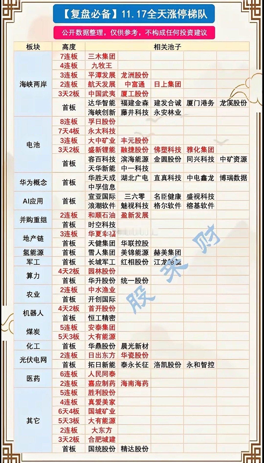 11.17周一收盘 涨停板股票 复盘统计!福建海峡两岸题材再次活跃,资金进入度高,统一预期势不可挡!另外,今日锂矿资源集体爆发,包括电解液VC价格跳涨,多股大涨。8连板 孚日股份7连板 三木集团6连板 人民同泰5连板 胜利股份