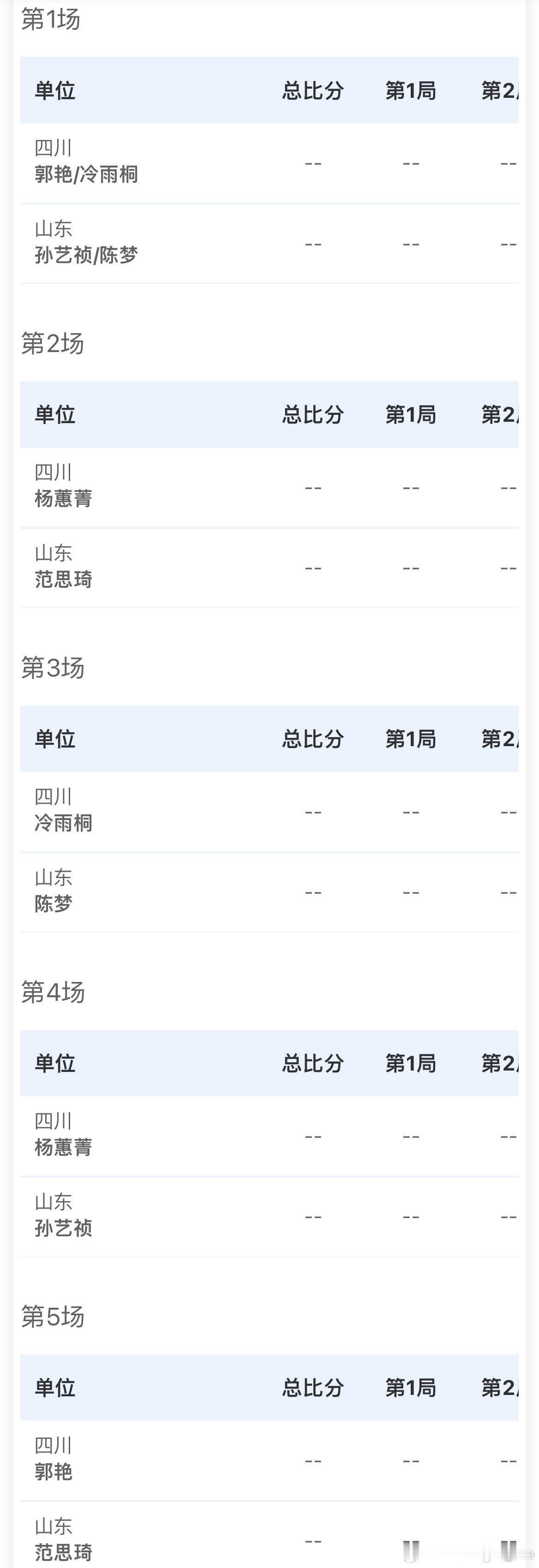 女子团体小组赛 - D组四川🆚山东郭艳/冷雨桐🆚孙艺祯/陈梦杨蕙菁🆚范思琦冷雨桐🆚陈梦杨蕙菁🆚孙艺祯郭艳🆚范思琦