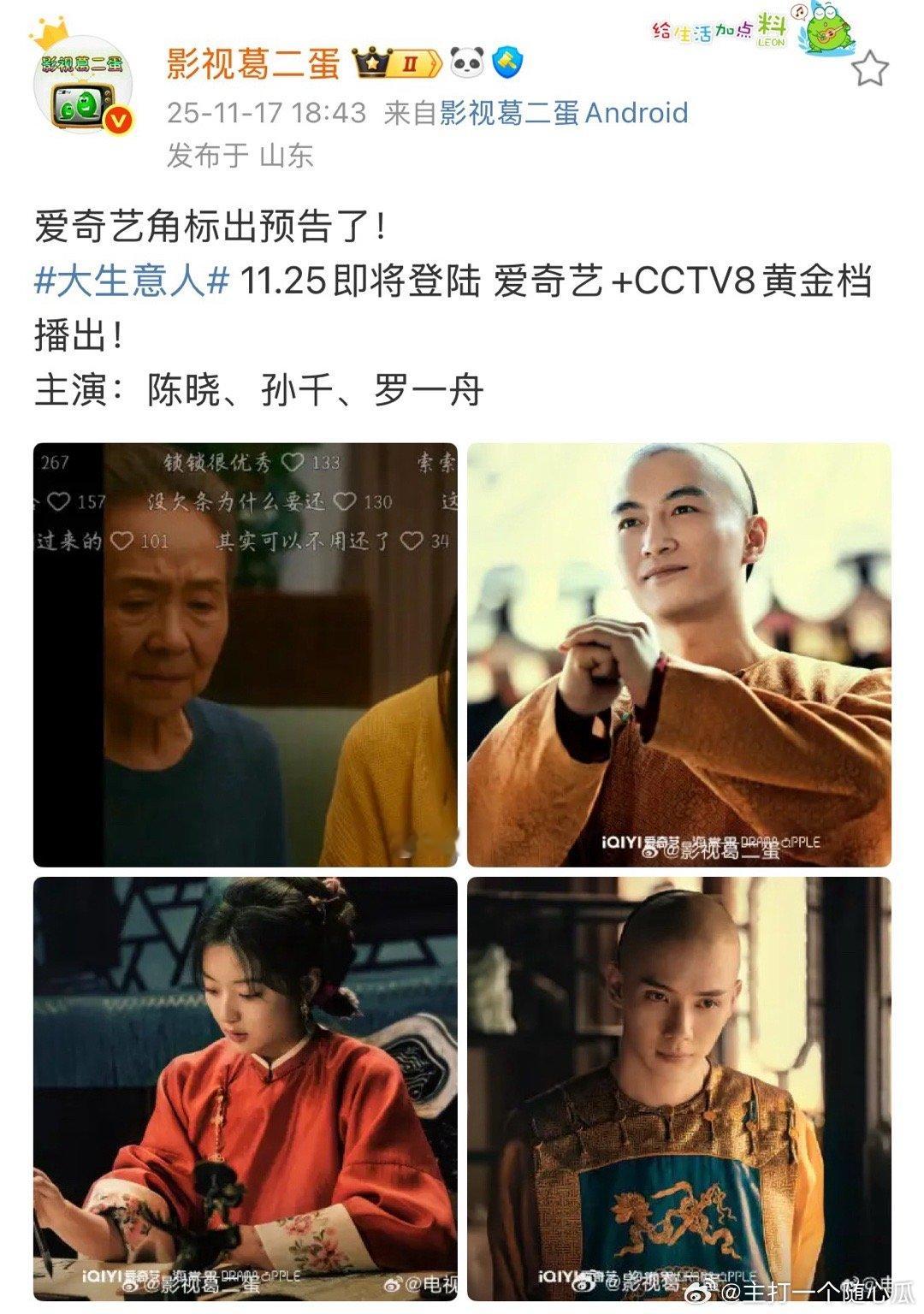 哇,陈晓孙千罗一舟大生意人11.25爱奇艺+CCTV8黄金档播出喔!