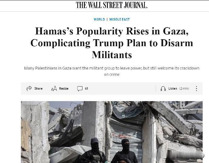 《华尔街日报》报道称,自加沙停火协议生效以来,巴勒斯坦“哈马斯”运动在加沙地区的民众支持率进一步上升,达到2023年以来的最高水平,这导致特朗普关于解除“哈马斯”武装的计划变得难以推进。 该报指出,“哈马斯”在加沙地区支持率回升的主要原因有两个: 在停火后即使部署警察在加沙各地恢复治安,“哈马斯”在当地的反对者也对犯罪率和抢劫率的下降表示欢迎。 加沙市的商人哈泽姆·斯鲁尔说:“即使是反对哈马斯的人,也渴望安全,因为我们已经目睹了安全局势的崩溃,盗窃、暴徒和无法无天的现象层出不穷。”他补充道:“除了哈马斯,没有人能阻止这一切,这就是人们支持他们的原因。” 在停火后保护了人道主义援助物资的运输与发放。联合国人道主义事务协调厅称,在停火之前,联合国及其伙伴机构提供的超过 80% 的人道主义援助物资被以色列支持的“沙巴布”等武装团伙拦截或没收,而停火后因为“哈马斯”的保护,援助物资的盗窃率下降到约 5%……