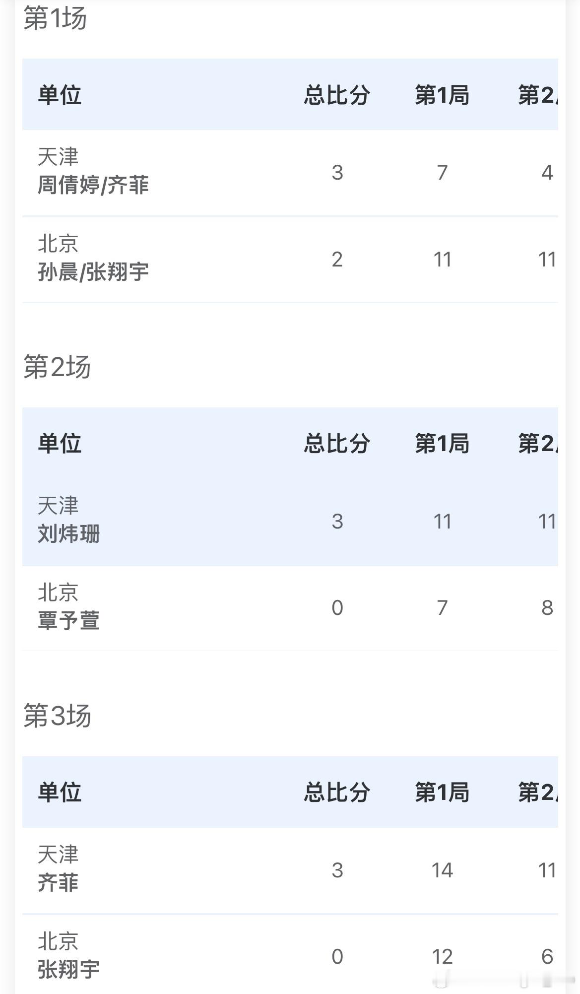 女子团体小组赛 - C组天津队3-0北京队周倩婷/齐菲3比2孙晨/张翔宇刘炜珊3比0覃予萱齐菲3比0张翔宇