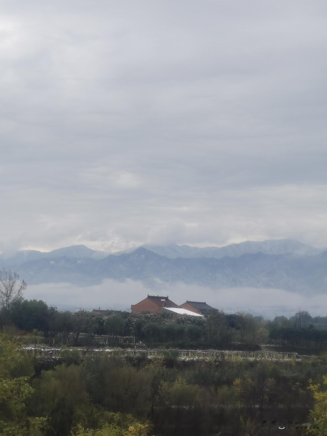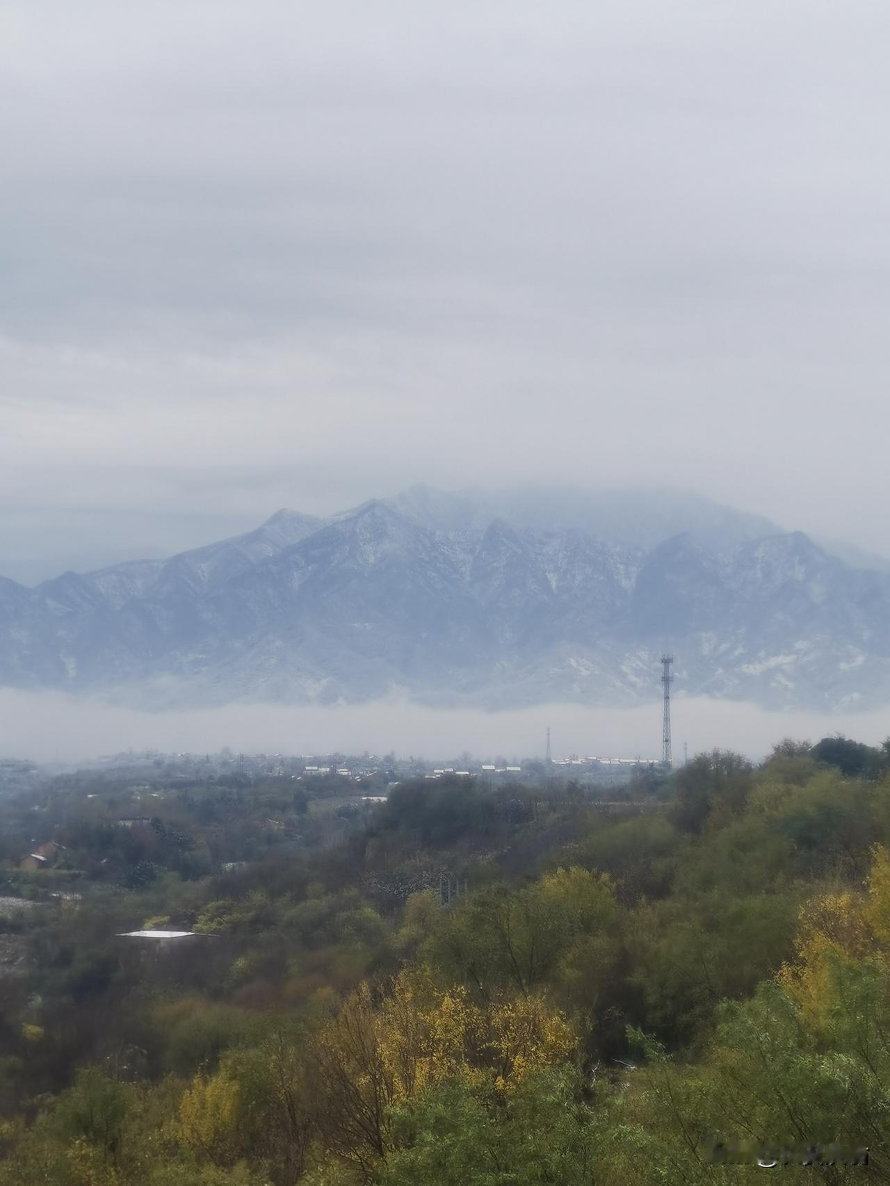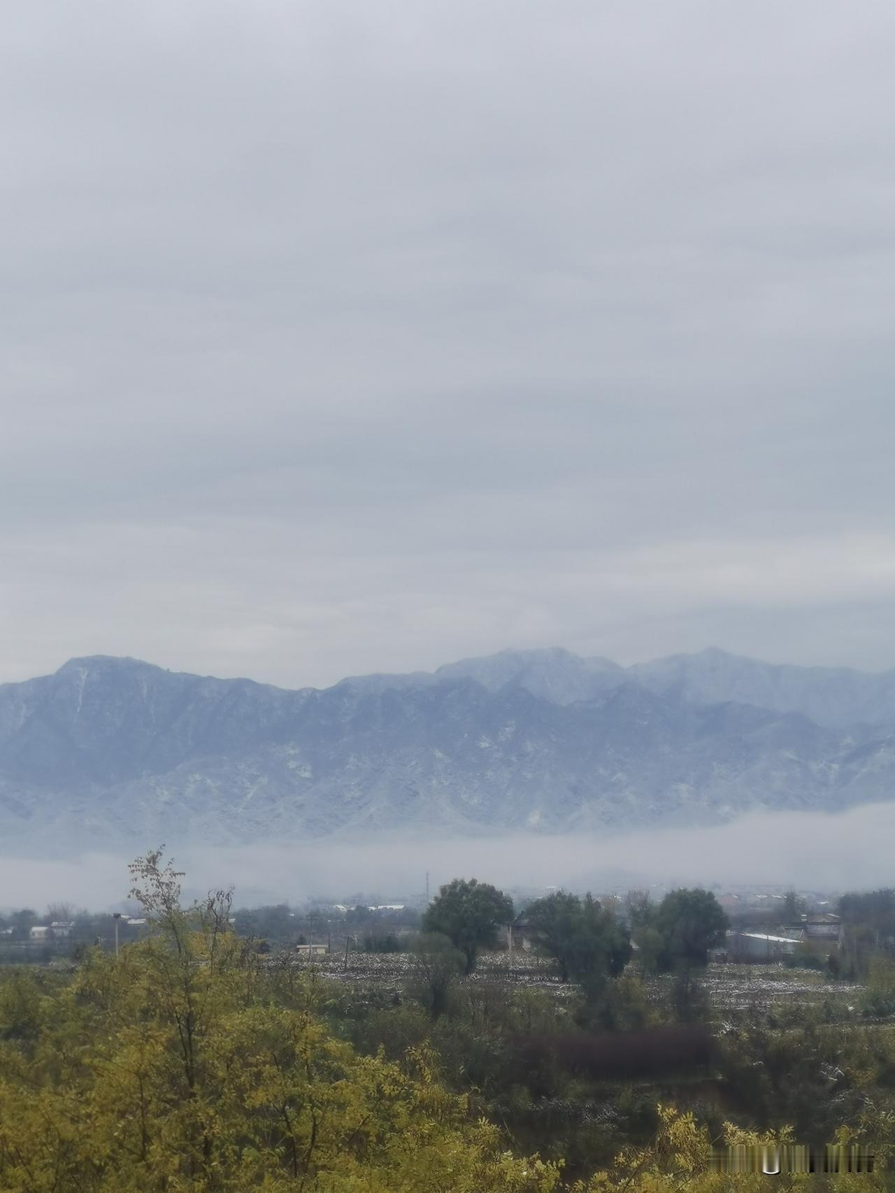 前天还是阳光灿烂20几度的天气,穿着薄毛衣走在街上人都会出汗。心想,这都入冬好几天了,气温咋还这么高?看来今年又是一个暖冬了。谁知昨天晚上下去了淅淅沥沥的雨,这一下就是一整宿。早上起来拉开窗帘,哇!树上、地面上都落了一层厚厚的积雪。这可是今年入冬以来的第一场雪啊,如此不经意却又让人深感意外。 我赶忙打开门跑出去,迎面一股冷风冻得我打了个冷颤。小区的地面,菜园子、树木上都被一层白雪所覆盖。楼前汽车的车顶,前后挡风玻璃、车门把手也都覆盖着一层雪,但我没有理会 ,而是快步走到南门外,想看看雪后秦岭的美景。我找了一处较高的土堆。拍了这组照片。我给它命名《雪后秦岭》。 远远看去,秦岭上下云雾茫茫,山体似乎被乳白色的云雾托举着,浮在半空,若仙境一般。虽然能见度不是很高,但仍能清楚的看到远处秦岭一列列黛色的山脊敷着的层层雪色,如一幅写意的山水画,浓淡相宜,蔚为壮观。