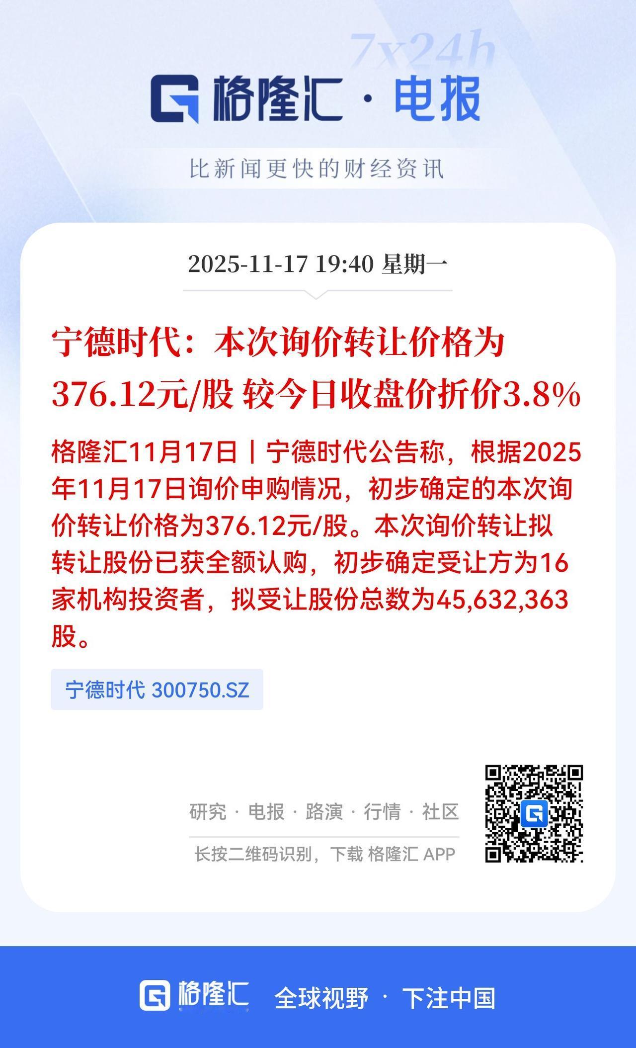 重大利好!宁德时代的股权转让只是微微折价,这释放了什么信号? 刚刚宁王超180个亿的股权转让价格出来了,宁德时代公告称,根据2025年11月17日询价申购情况,初步确定的本次询价转让价格为376.12元/股。本次询价转让拟转让股份已获全额认购,初步确定受让方为16家机构投资者,拟受让股份总数为45,632,363股。 此次股权转让较今天的收盘价,只是折价了3.8%。这说明了什么? 这无疑说明了宁德时代这个标的未来成长性好,股权转让具有较大的议价能力!所以股权转让方能获得较大的话语权和收益空间。 宁德时代作为中国乃至全球最大的电池企业,市场占有率高。随着未来固态电池的全方位推进,未来成长性有保障。 今天锂电板块在周末的狂吹下,涨幅虽然只有高达近2个点,但在今天全市场走成这样疲弱的背景下,已经相当不错了。 而且今天宁王因为周五盘后的股权转让事情,导致今天大跌了几个点,拖累了整个板块。现在宁王的股权转让价出来,折价不大,而且受让人在6个月内不能转让。这也给了市场充足的时间来消化。 所以明天A股锂电板块继续走强概率较大!大家觉得呢?