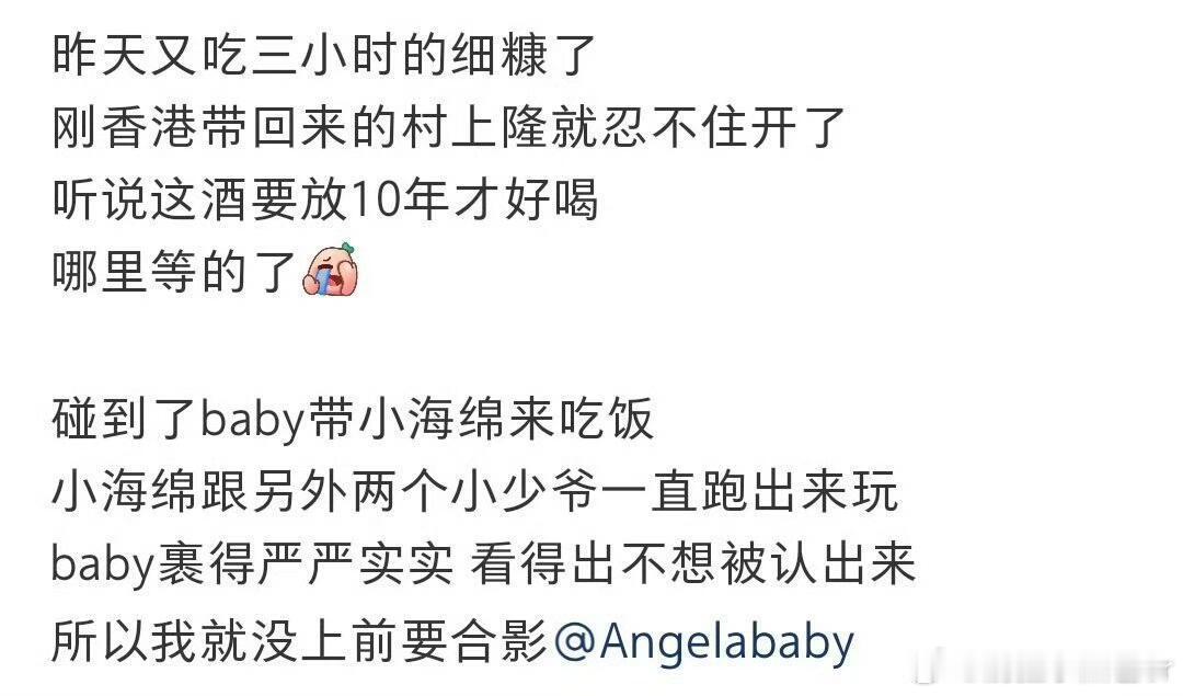 小海绵都长这么高了!Angelababy把他保护得好好!11月15日网友偶遇baby带小海绵吃漂亮饭,印象最深刻就是,她带着小海绵参加粉丝的见面会,至今没有小孩的照片流出,真的好厉害,把他保护的很好🐮