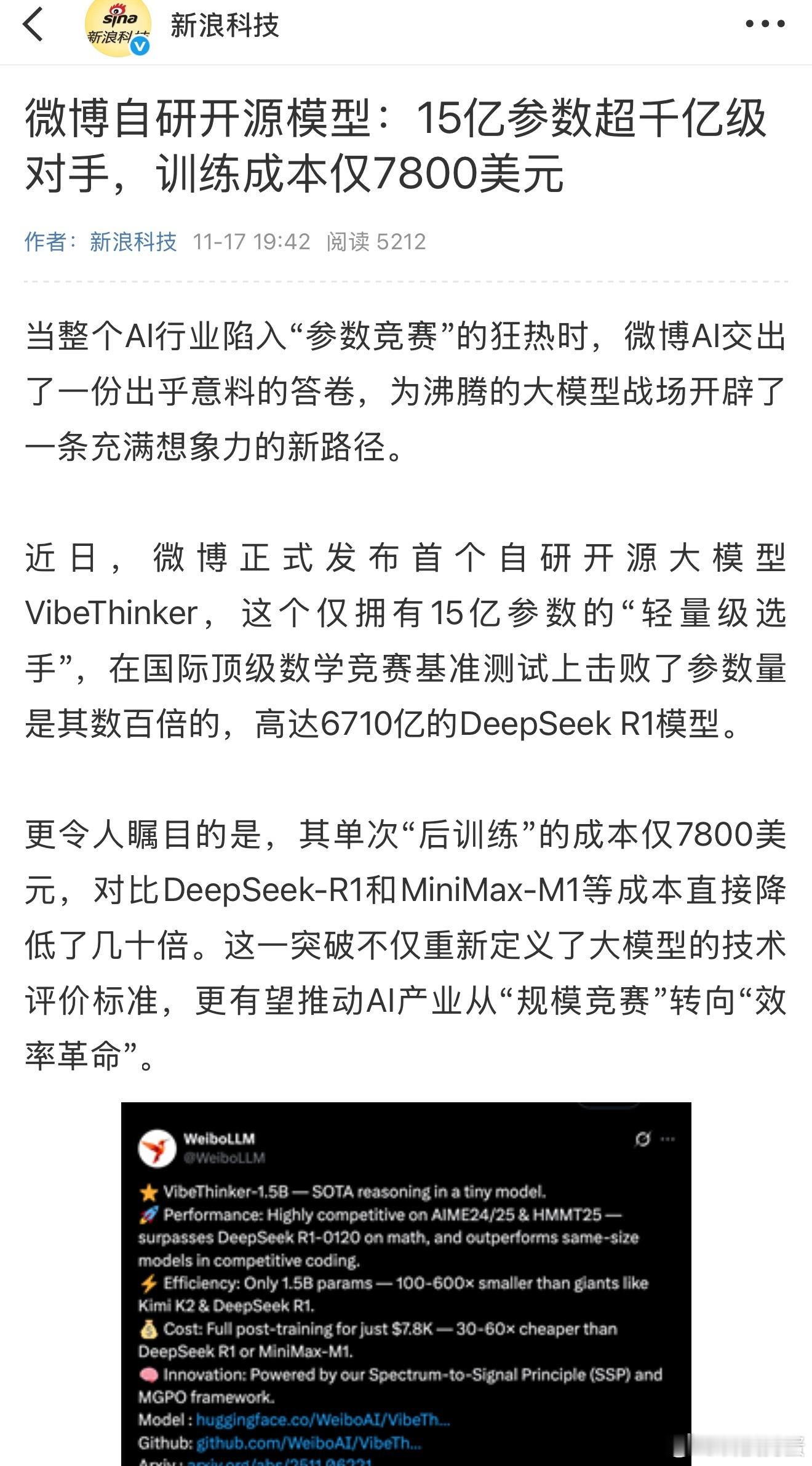 微博刚发的新模型,有点东西啊参数才15亿,数学测试反超了6710亿的DeepSeek R1。主要是训练只花了7800美元,跟那些烧几百万的模型比,性价比高拉满了。所以说,搞AI不一定非要疯狂堆参数,找对方法其实更管用。当然也不是说小模型就全面碾压了,复杂任务可能还是大模型更强。AI研发正在变聪明,不再只是比谁参数多,而是比谁方法巧。未来,说不定真就是“四两拨千斤”的时代了。