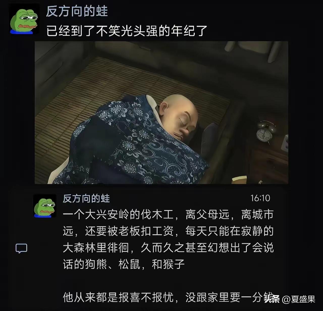 光头强, 小时候看,光想笑, 现在看,只想哭。 原来我们都活成了光头强, 扛着没人懂的累, 吃过独自硬撑的苦, 却依然在生活里跌跌撞撞,不肯认输, 也不肯放弃对温暖的向往。