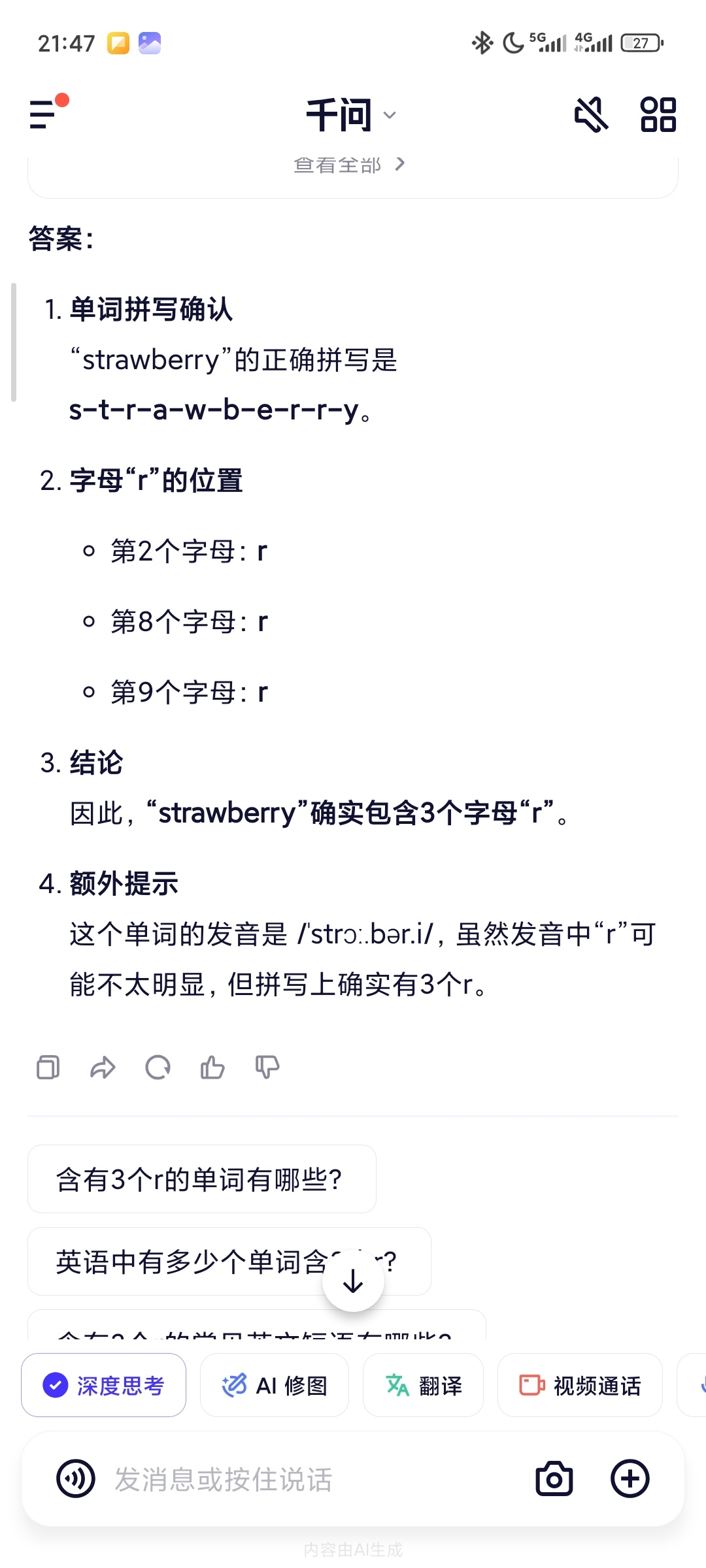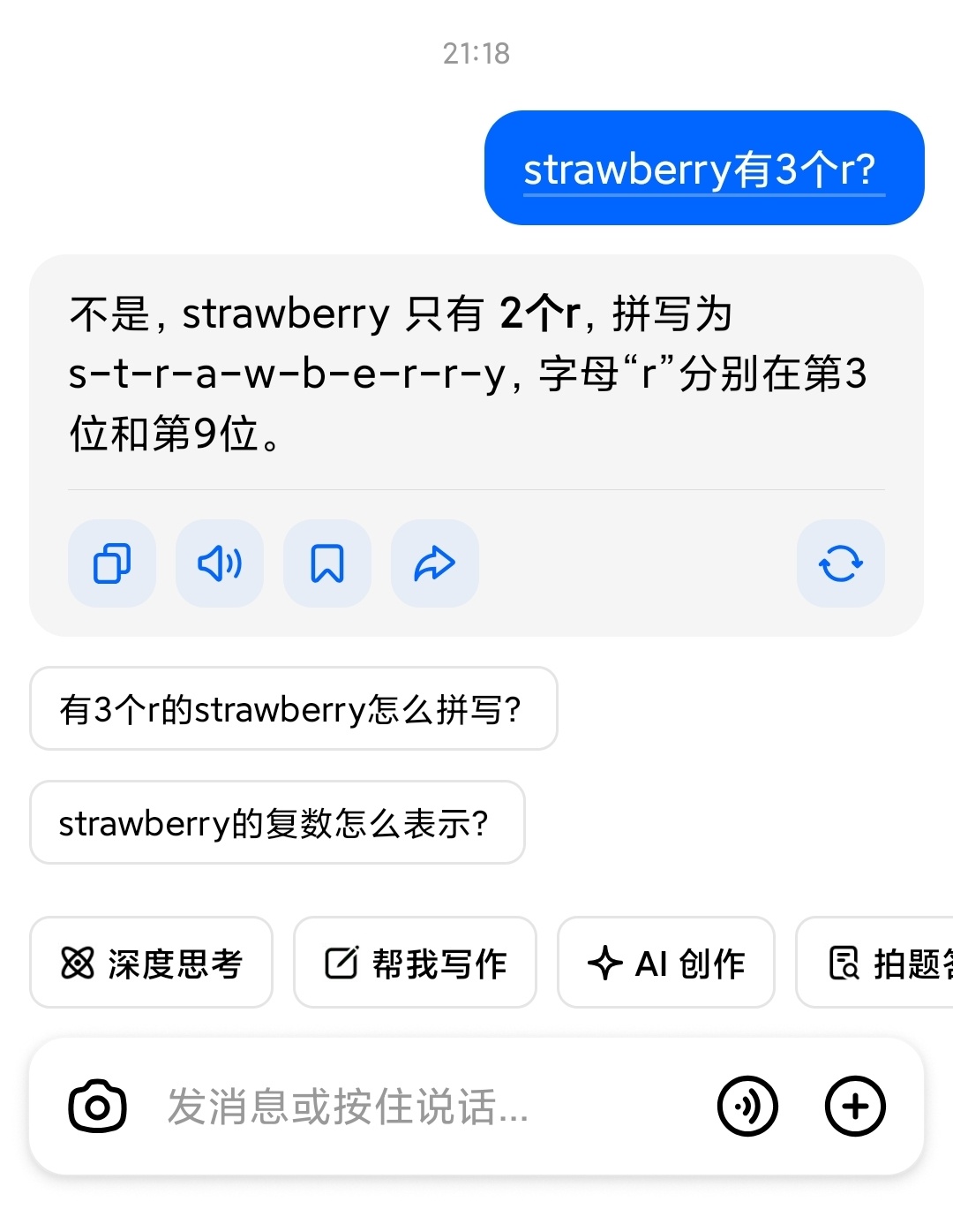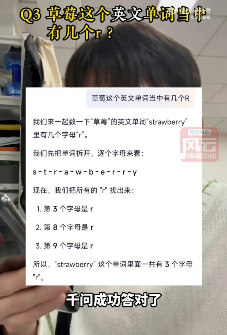 11月17日,阿里巴巴的“千问”项目千呼万唤始出来,伴随着这一重大事件的趣闻,却是一个3岁小孩的智力评测题——草莓strawberry单词中一共有几个 r ?这个看似很简单的问题,很多AI大模型却在这里翻了船。其实,通过这个问题就能看出来我们人类和AI的根本区别,我们人类有属于自己的常识,懂得灵活变通。AI的思维模式是机械的,刻板的,循序渐进的。我们未来的社会就是充分利用好人类的发散型思维和AI的机械思维,一个开拓创新,一个保证犯过的错误不再犯。这种合作模式,这就好比一台盾构机,人类给机器提供方向和灵魂,AI机器能保证执行好这个方向,并铺设好预制板。
