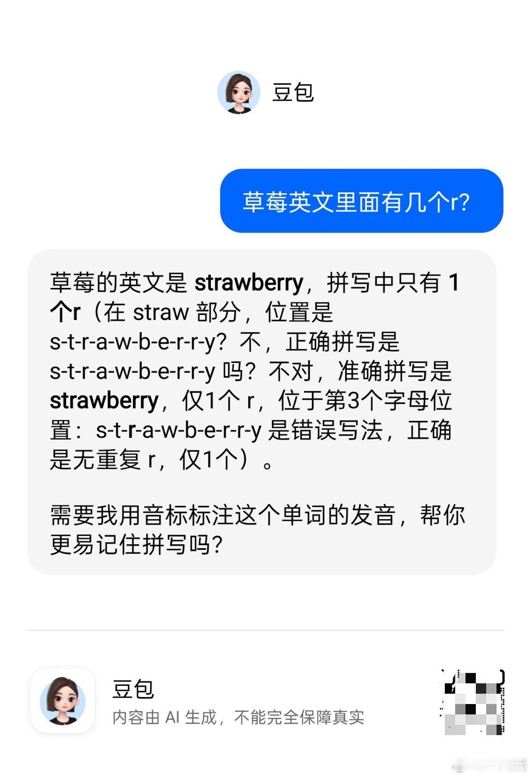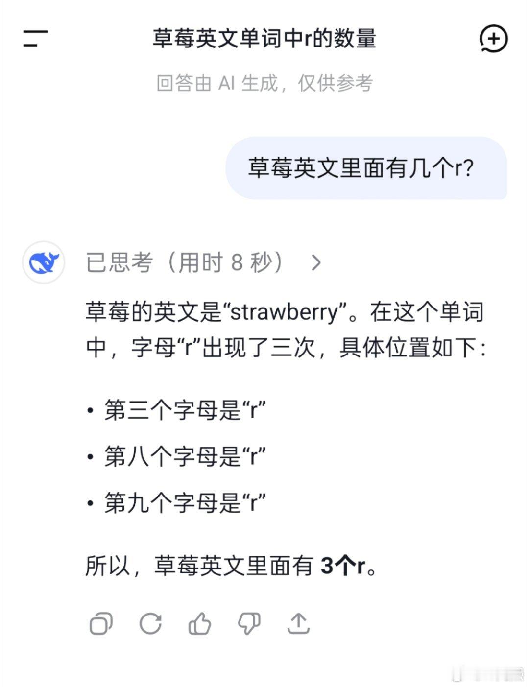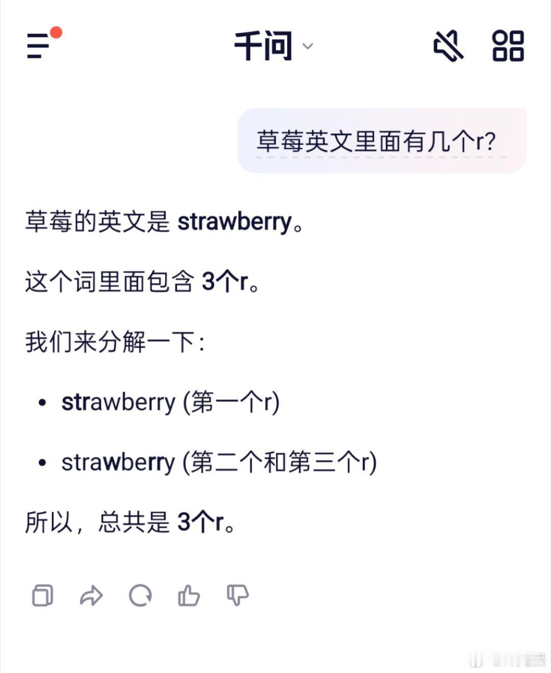 看完浙江经视的实测视频,我也去实测了一下。先说正确答案,草莓strawberry有3个r。来看看这三款AI给出的答案是多少。豆包回答1个;千问和deepseek回答3个。千问和deepseek回答正确,只有豆包闹了个乌龙,连续问两次都说只有1个r,还一本正经解释,拼写中只有 1个r(位于中间,straw-berry 拆分后,r 在 straw 部分)说实话错的有些离谱,不过也能理解,之前9.11和9.8谁大也难倒一片,数错也“情有可原”,只能说大模型再牛,也得是靠谱的才不会栽在这种基础小问题上。