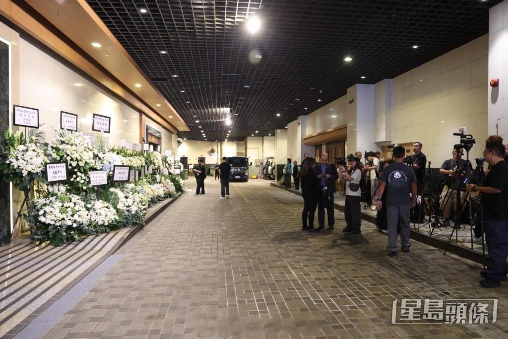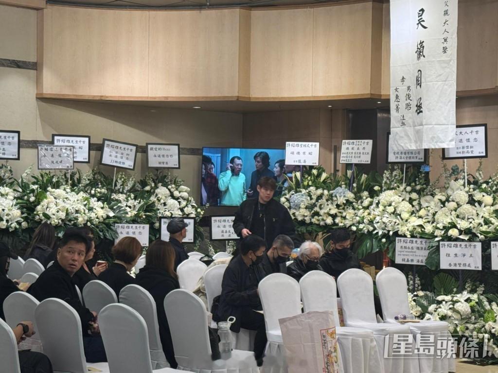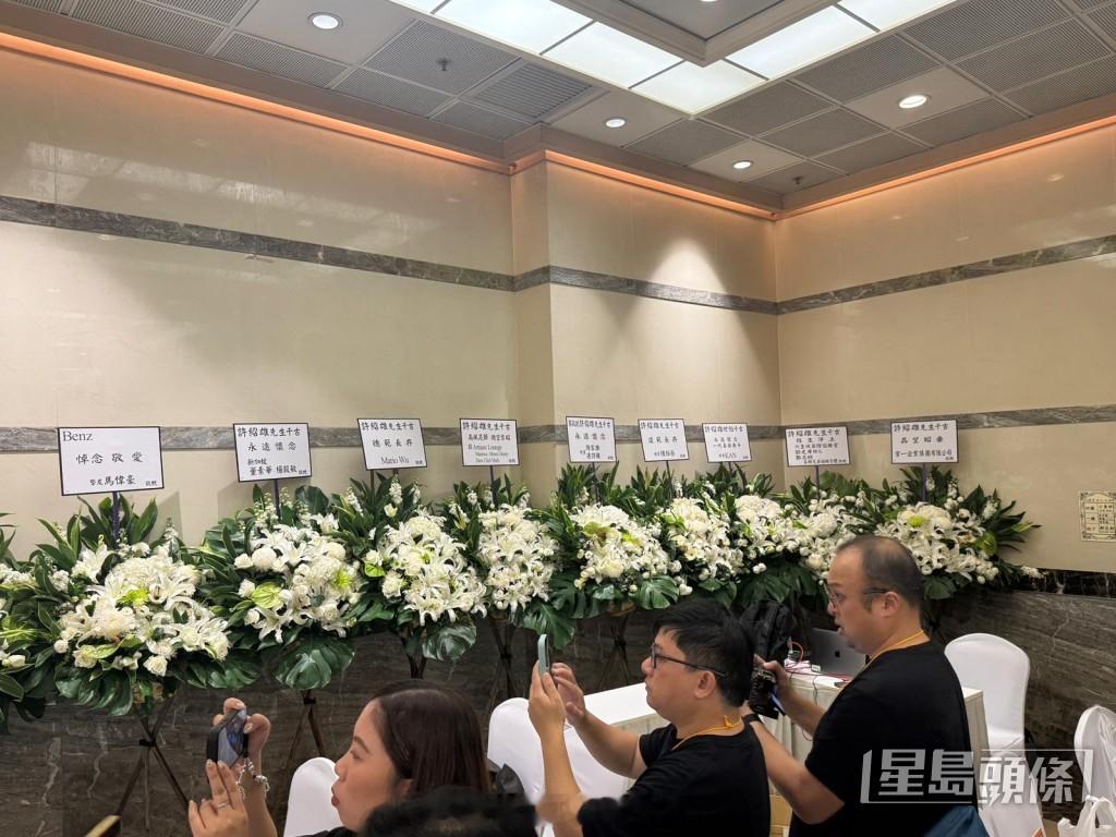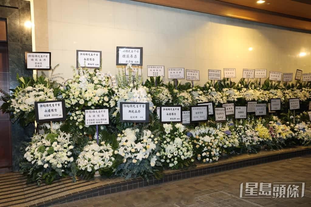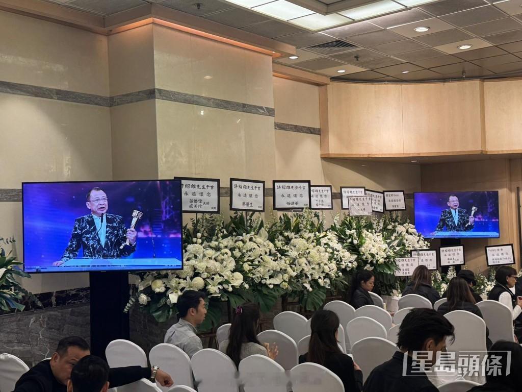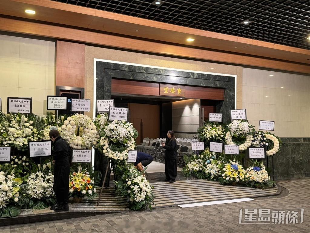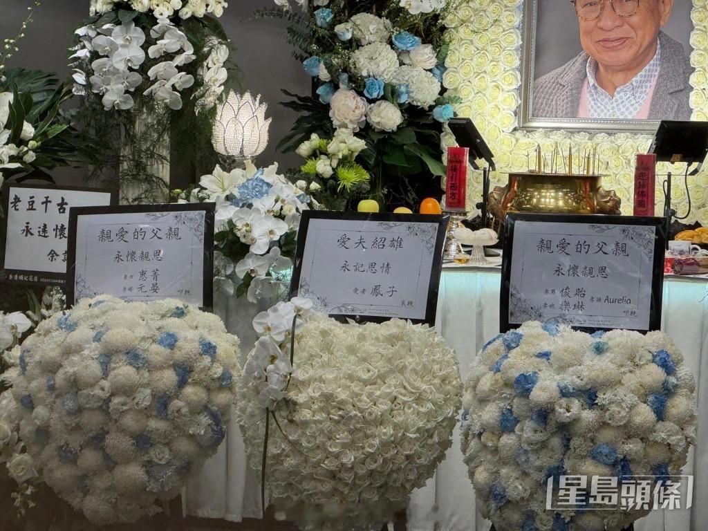 许绍雄设灵丨灵堂布置庄严设电视播放生前佳作 爱妻难舍老公“爱夫绍雄永记恩情”女儿“永怀亲恩” | 星岛头条人称“Benz雄”的许绍雄10月28日因肾癌引发器官衰竭离世,积闰享寿八十有余岁。其家属今日(17日)在大围宝福纪念馆为许绍雄设灵,虽然家属曾表示希望亲友以捐款代替赠送花篮,但大批圈中人仍送上花牌悼念,灵堂内外摆满花牌,如花海一样。许绍雄设灵丨处处见心思许绍雄的灵堂入口处,摆放三幅许绍雄生前的照片,当中包括《使徒行者》系列“欢喜哥”造型,照片前方摆有白色菊花。灵堂内四周同样摆满花牌,用上白合及白菊花,而且设计统一,可看出处处见心思细节。灵堂的布置非常庄严,许绍雄的遗照笑容满面,拣选穿西装的照片,以五层玫瑰花包围照片,旁边用上白、蓝色花做装饰,横匾写上“永远怀念”,祭文布“父亲大人冥鐾 昊靝罔极 孝女惠菁 男俊贻泣血”挂在左边。灵前摆放三个花篮,中间为许绍雄太太“凤子”龙嬿而,花篮上“爱夫绍雄 永记恩情”下款为“爱妻”。而女儿许惠菁与老公元晏的花篮,写上“亲爱的父亲 永怀亲恩”,许绍雄的继子就以一家三口致意。许绍雄设灵丨全方面照顾许绍雄灵堂内摆放多部电视,当中播放许绍雄生前的影视作品,得奖画面,以及与圈中好友的合照。此外,摆放在旁边的两张长枱,放有生果、食物,又有大量支装水、柠檬茶、纸包饮品,连纸杯及热水壶、茶包都有准备,照顾周到。