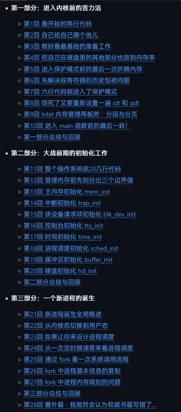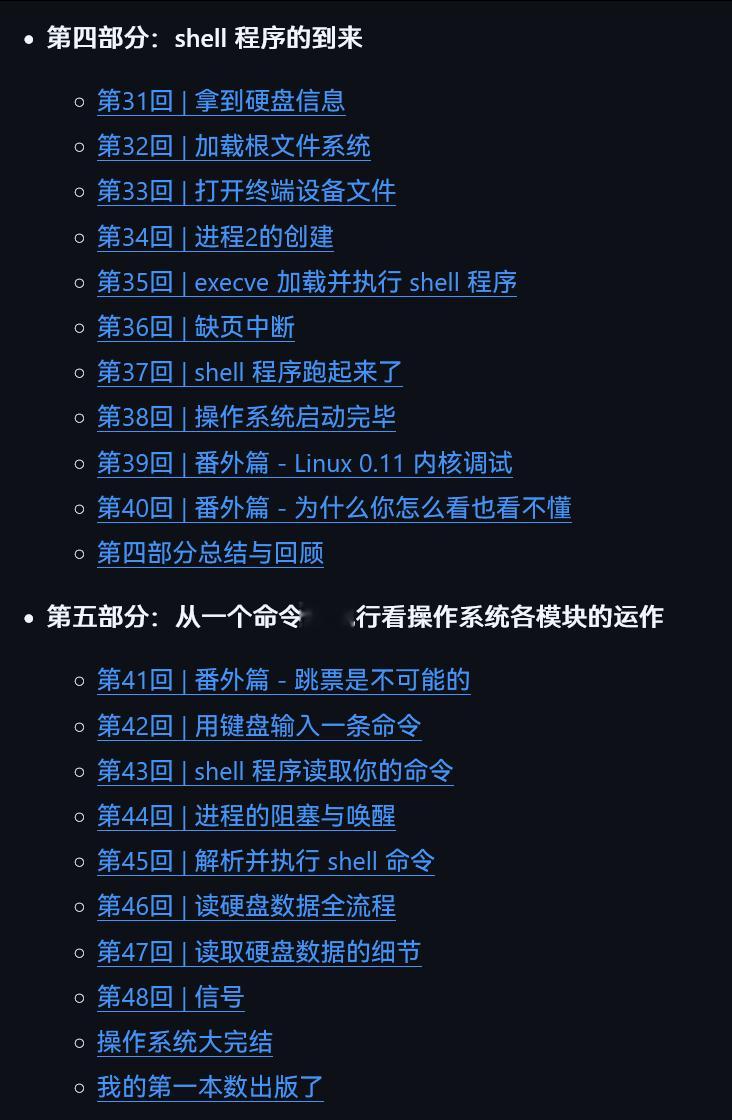 经典重发:你管这破玩意叫操作系统源码 — 像小说一样品读 Linux 0.11 核心代码 github.com/dibingfa/flash-linux0.11-talk“你管这破玩意叫操作系统源码 —— 像小说一样品读 Linux 0.11 核心代码在这里面,我不会经常把操作系统的体系架构挂在嘴边,时时刻刻强行塞到你的脑子里,而是通过一行一行代码逐渐带入情节,最终让你不知不觉地发现,原来整个操作系统的体系就这样一点一点建立起来了。本系列的每一章内容都很短,千万不要有心里负担,而正是这些简单的事情联系到一起,就构成了整个操作系统的复杂的设计。所以也导致了,单独看任何一章都不会有显著的收获,但如果整个系列都能跟下来,并且每一章的内容都能做出思考,把不懂的地方及时解决,我保证你会对操作系统有一个全新的,深入到细节的认识。希望你跟我走完这个系列,也能发出一句感叹,原来操作系统源码不过如此,就是这么个破玩意而已!但同时,你也要有耐心,你不要总想着,读到这了我怎么还是没觉得自己懂操作系统了呢?怎么还是没讲多进程如何调度呢?记住,享受当下,当下你学的每一个看似没啥用的知识,都是后面豁然开朗这种感觉的基石。”