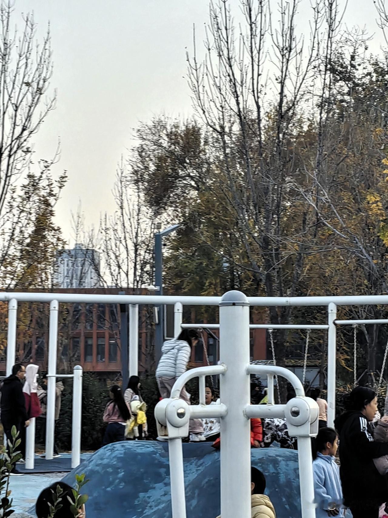 昨天石家庄的天气就开始降温了,还有风。天气晴,太阳光还真不错,小宝说想去公园荡秋千。 离家不远的地方,就是时光智慧体育公园。公园的位置就在建华街与和平路交叉口的东南角上,这可是一家新建的体育设施齐全的公园。 这个公园的旧址原来是煤矿机的厂区,2022年经过城市改造新项目成为了公园,为我们市民提供了一个综合性的活动场地。 里边绿树成荫,环境很好,并设有篮球场,网球场、和专业的塑胶跑道,给我们提供了充足的锻炼身体活动的好场地。 最大的亮点就是有儿童活动区域。不但有攀爬架、滑梯、还有秋千。带着小宝玩的很开心的荡秋千,小朋友们都排着队等着笑声不断。