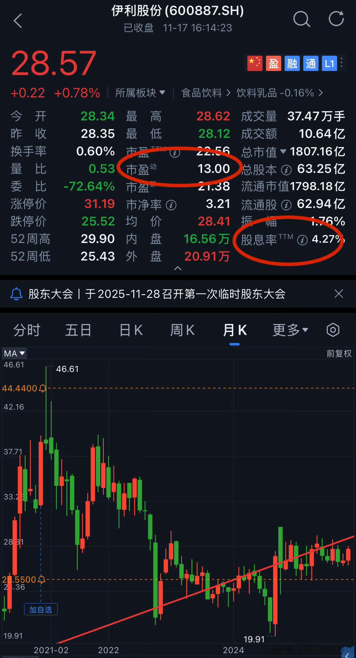 伊利实盘十年 收盘现价买入 28.57 * 5万股 = 150万唯一动作:分红收盘价购入唯二动作:十年内提前达峰四倍I。时Sell 100万市值十年内若没有出现此类癫狂就完全不用管