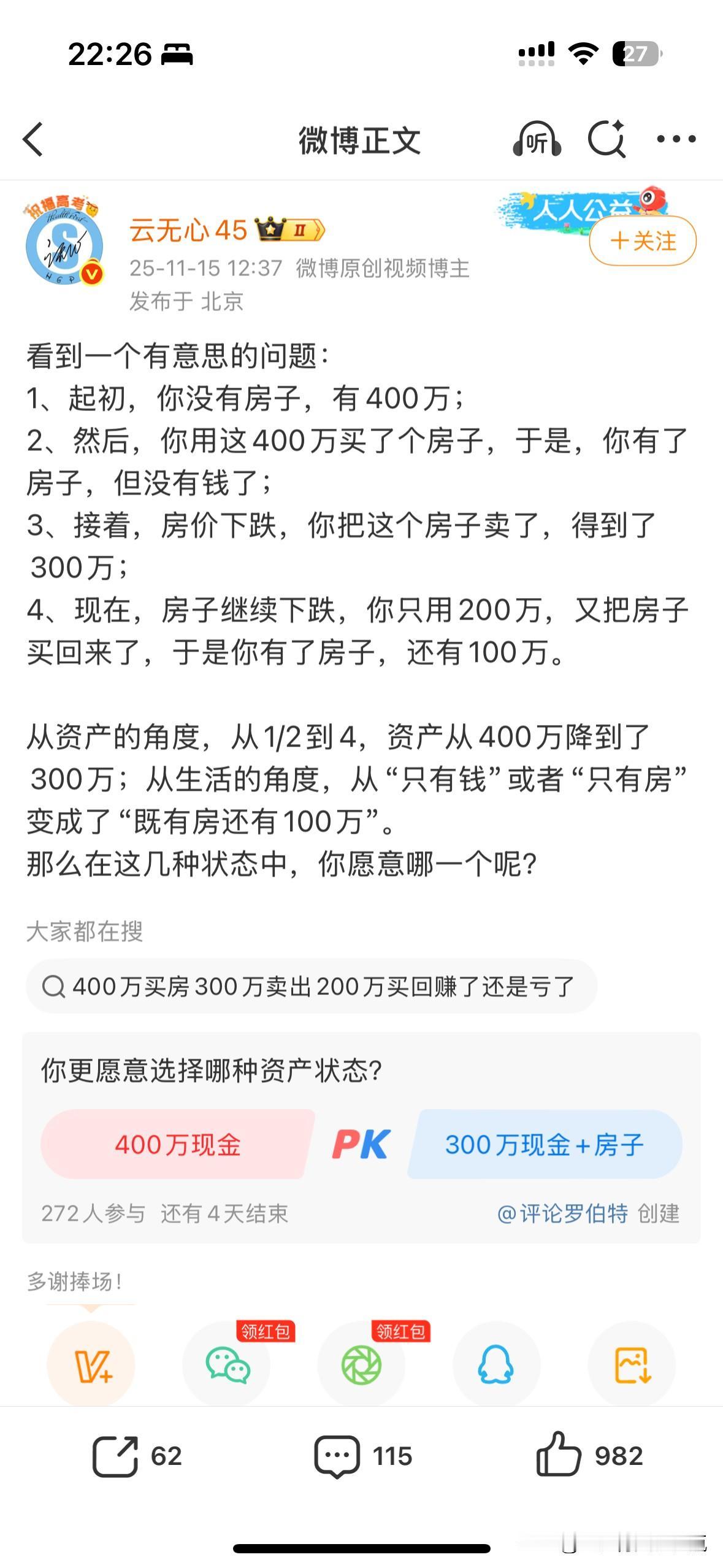 这个问题真的是世界观、人生观、价值观的整合啊! 你可能有钱没房;也可能有房没钱;也可能钱房都有;也可能钱房都没有。 钱和房都没有?比如租房。有可能,如果你只想只租不买。 当然也不一定。比如你中间发现钱足够买房了。