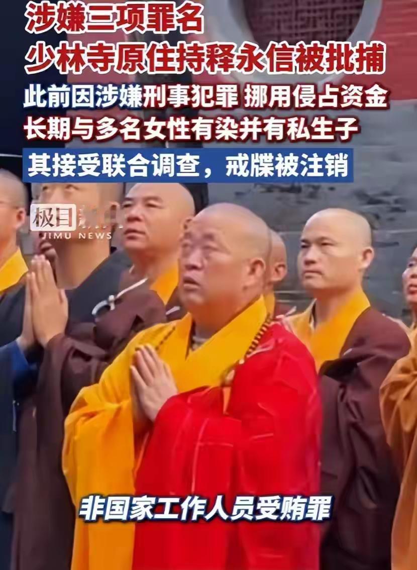 人生兜兜转转,让人不得不相信因果轮回: 我们看看释永信就知道了,他穿了半辈子袈裟,住了半辈子寺院,风风光光,吃香的喝辣的,生儿育女。 这哪是当和尚,分明就是土豪的日子。 可他内心深处,应该没做过一天和尚吧。 标准的一个花和尚,假和尚的行为。 可是现在呢? 他离开了寺院,脱下了袈裟,被取消了度牒,走进了监狱,这一次才是开始真真正正的修行。 有点令人难以置信。 可是,确实存在的事实。 现在,虽然他不当和尚了,可是,好像他的修行才刚刚开始。 他要在监狱里度过他的余生。 这人生兜兜转转,让人不得不相信因果报应。 释永信逮捕了,三宗罪成立。 在以后漫长的岁月里,他会如和尚一样,戒酒戒色,戒骄戒躁。 当然,对于即将开始的铁窗生涯,他应该不会犯难犯怵,应该很适应。 因为这才是和尚真正的生活。 清规戒律,粗茶淡饭,深居简出,戒酒戒色。 觉得释永信把日子过反了。 本应该戒律清规,可他莺歌燕舞,左拥右抱。 本应该四大皆空,可他红尘作伴,活的潇潇洒洒,策马奔腾,共享人生繁华。 释永信,作为一名寺庙主持,她忘却了自己的身份,在花花世界里,迷失了自己。。 这一次,迷失的彻彻底底,让自己永远没有了翻身的机会。 当一个人连自己的信仰都背叛,那这个人已经迷失在花花世界里,陷入沉沦。