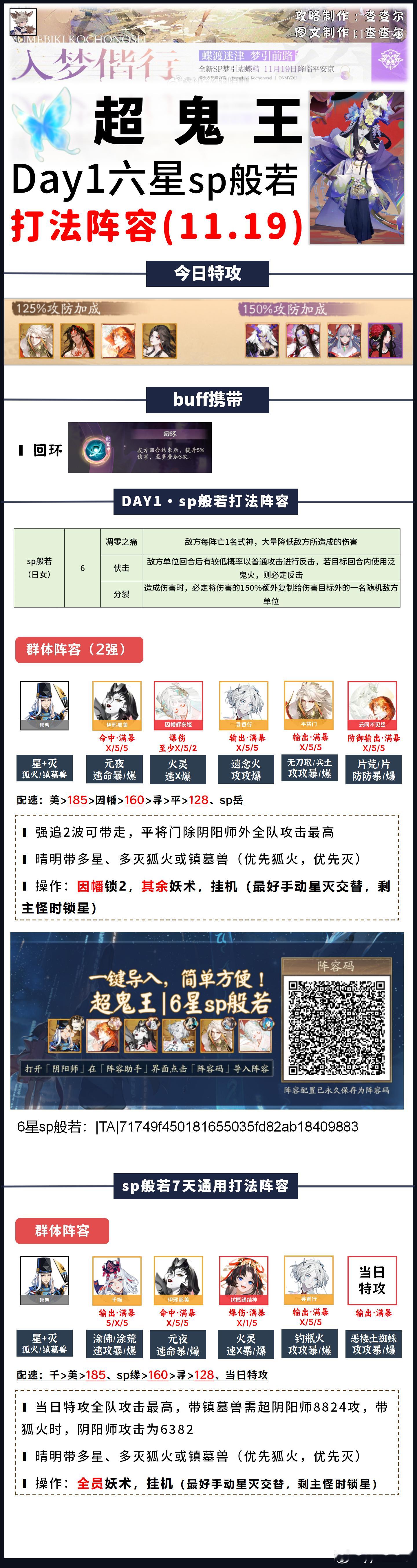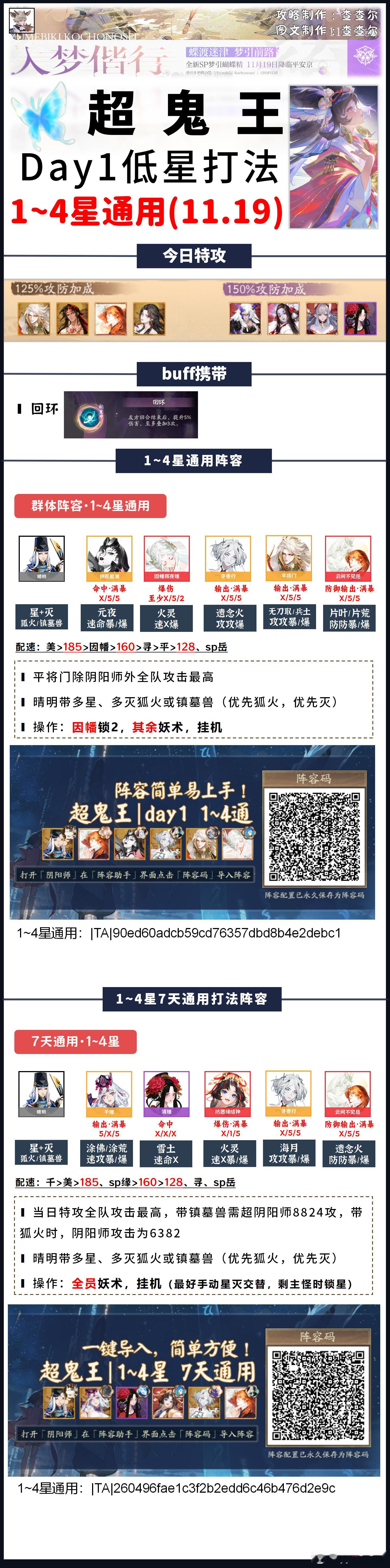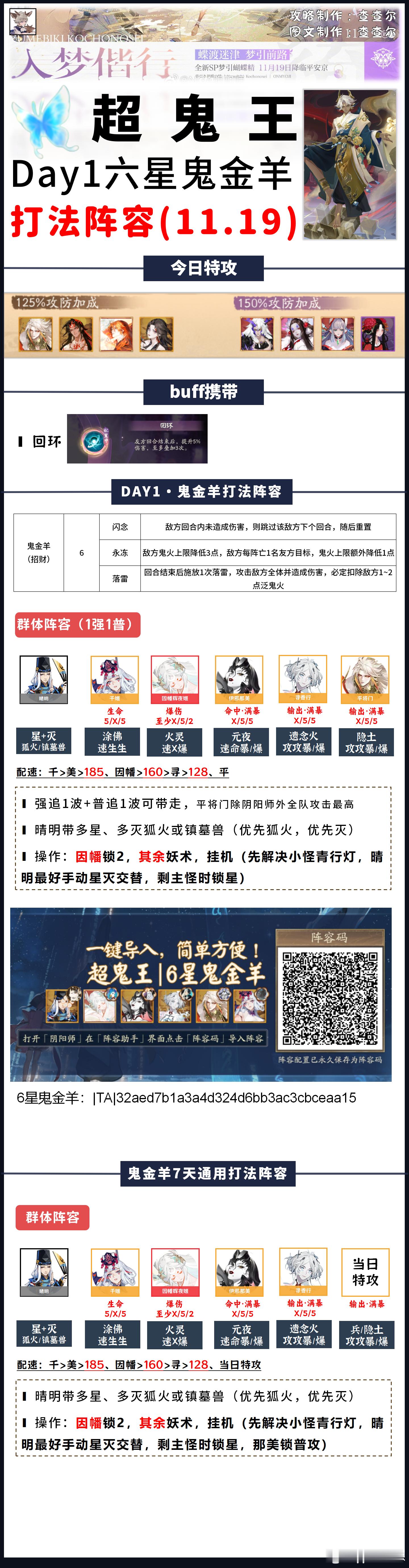 【超鬼王】Day1全鬼王阵容+活动介绍请看完简介,含门票刷取推荐+契灵推荐■图一:玩法介绍+每日特攻■图二:商店内容一览■图三:1~4星通用打法(含7天通用)■图四:5星day1打法■图五~图十四:6星打法+6星通用阵容模板参考活动时间:11.19~11.25■目前测下来的门票获取:①单局耗体越多,门票掉率越高,单局魂王(神罚)掉率最高②组队觉醒最省体力③用5倍券刷契灵·探查是目前最快刷完每日鬼王票的办法每日门票情况:■每日免费得54张门票,商店每日可花150勾买5张■6星掉率很随机,但基本每天稳定在1~5张之间(5张极少,1~2张是常态)■7天花勾不氪只打满自己的鬼王大概率不超2000w积分■7天花勾+氪花合战+打满自己鬼王大概率不超3300w积分契灵■本次可用到狐火契灵,3灭3星,优先灭(3灭0星也能用)狐火的好处是增加了阴阳师命中但没增加阴阳师攻击,所以输出式神超其它式神即可,阴阳师攻击仅为6382■镇墓兽3星3灭没被淘汰,之前怎么用,这次还怎么用。我没刷到3灭狐火,所以我一直带着镇墓兽打的■3豹眼茨球可以用来打6星平将门,没有可以用3豹眼镇墓兽替换,或者不带契灵也行(最多2普,肯定能带走)■其余契灵暂时没在本次超鬼王找到好的用途关于阵容:阵容可能会有优化,如果正式服调整了副本难度,我会在评论区和大家说,正式服测完如果有更好的打法我也会及时转告大家并及时发动态更新因超鬼王工作量巨大,如有配置失误还请大家多多包涵,感谢大家支持(有配错的我及时更正)