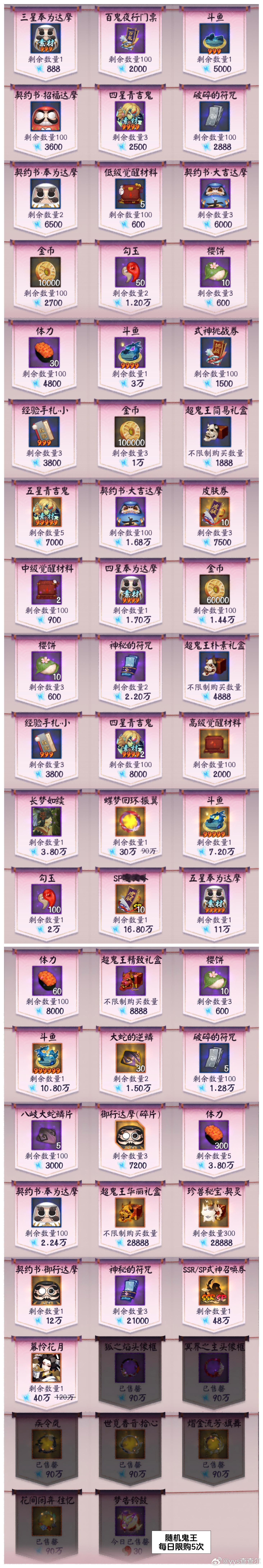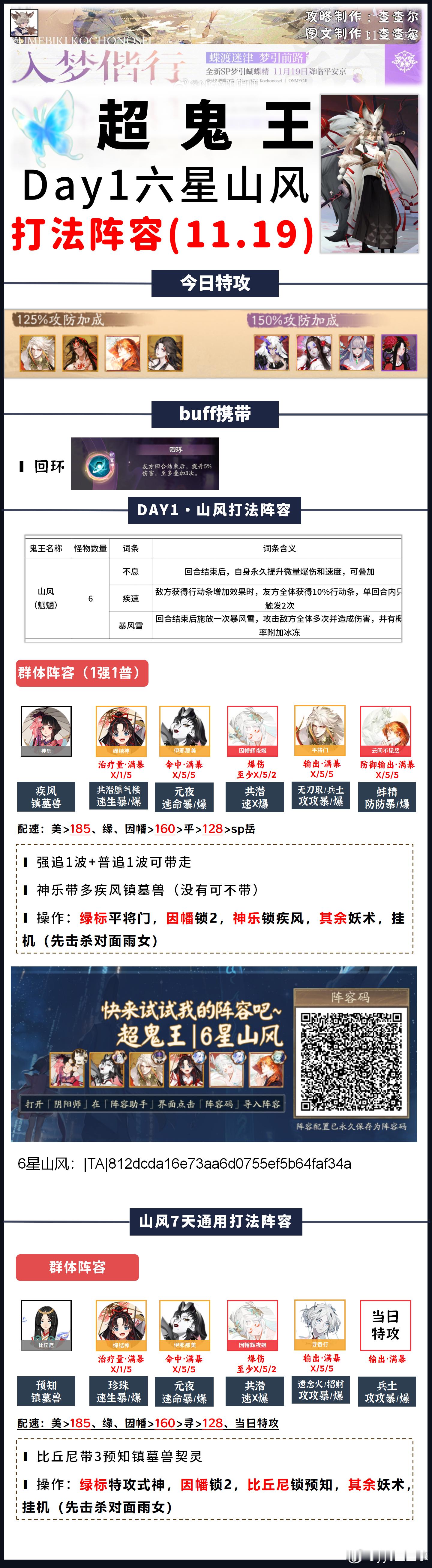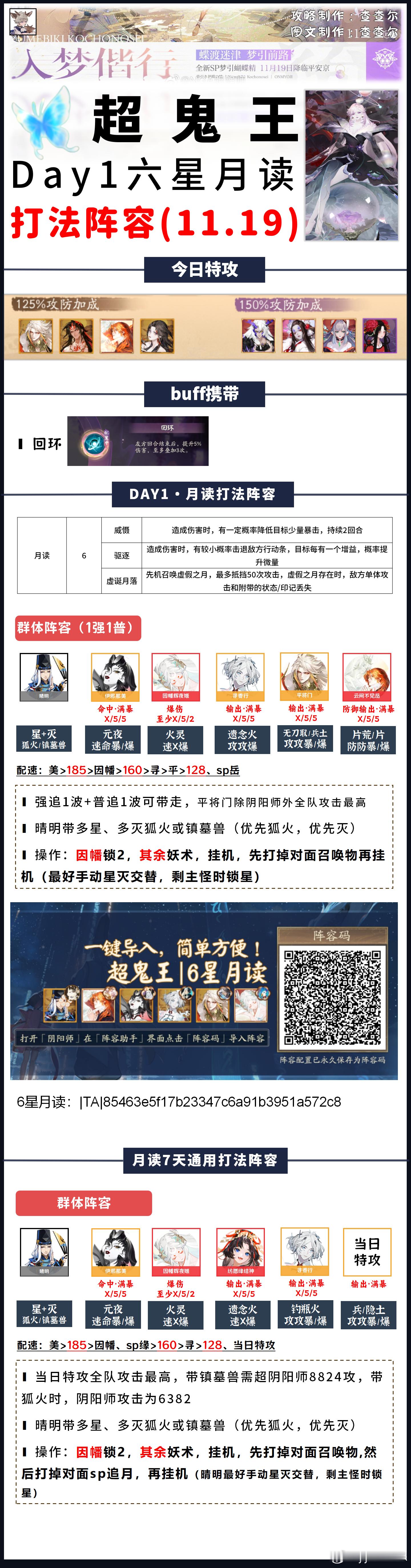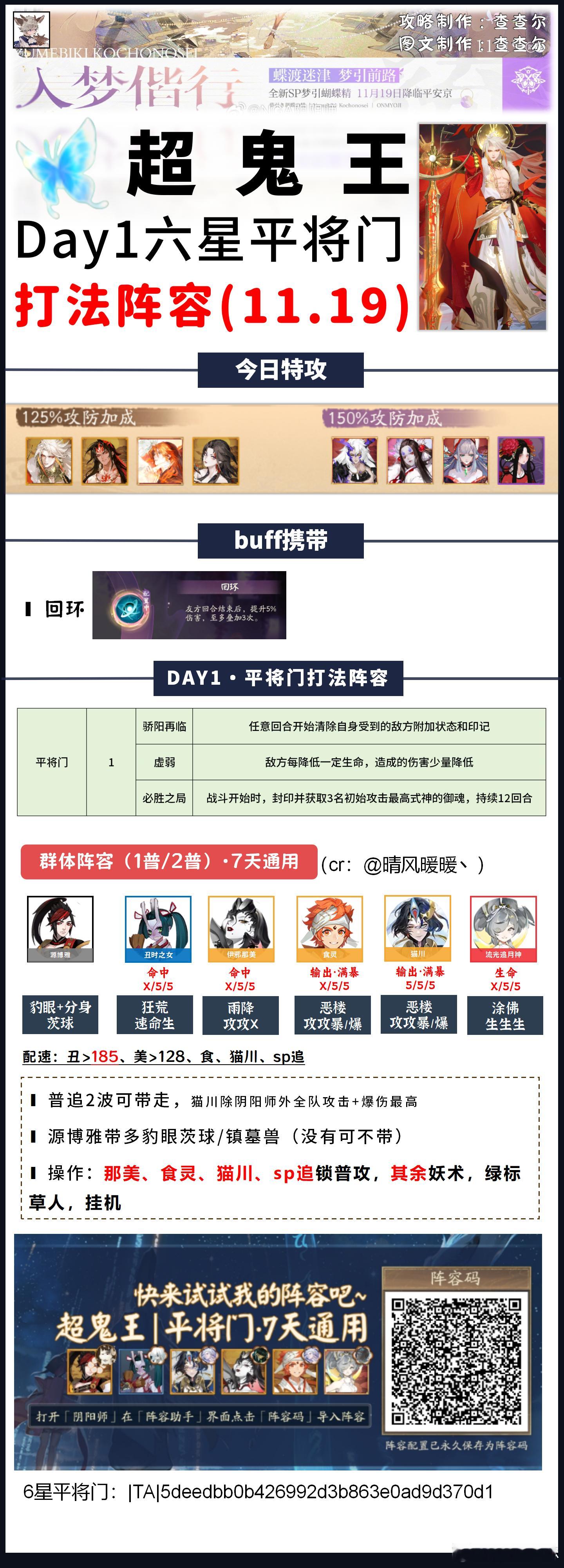 【超鬼王】Day1全鬼王阵容+活动介绍请看完简介,含门票刷取推荐+契灵推荐■图一:玩法介绍+每日特攻■图二:商店内容一览■图三:1~4星通用打法(含7天通用)■图四:5星day1打法■图五~图十四:6星打法+6星通用阵容模板参考活动时间:11.19~11.25■目前测下来的门票获取:①单局耗体越多,门票掉率越高,单局魂王(神罚)掉率最高②组队觉醒最省体力③用5倍券刷契灵·探查是目前最快刷完每日鬼王票的办法每日门票情况:■每日免费得54张门票,商店每日可花150勾买5张■6星掉率很随机,但基本每天稳定在1~5张之间(5张极少,1~2张是常态)■7天花勾不氪只打满自己的鬼王大概率不超2000w积分■7天花勾+氪花合战+打满自己鬼王大概率不超3300w积分契灵■本次可用到狐火契灵,3灭3星,优先灭(3灭0星也能用)狐火的好处是增加了阴阳师命中但没增加阴阳师攻击,所以输出式神超其它式神即可,阴阳师攻击仅为6382■镇墓兽3星3灭没被淘汰,之前怎么用,这次还怎么用。我没刷到3灭狐火,所以我一直带着镇墓兽打的■3豹眼茨球可以用来打6星平将门,没有可以用3豹眼镇墓兽替换,或者不带契灵也行(最多2普,肯定能带走)■其余契灵暂时没在本次超鬼王找到好的用途关于阵容:阵容可能会有优化,如果正式服调整了副本难度,我会在评论区和大家说,正式服测完如果有更好的打法我也会及时转告大家并及时发动态更新因超鬼王工作量巨大,如有配置失误还请大家多多包涵,感谢大家支持(有配错的我及时更正)