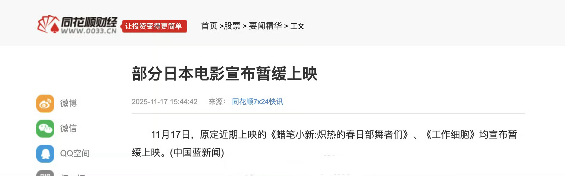 网传近期国内将不会上映日本电影,已经定档的《工作细胞》《蜡笔小新》《初吻》《昨日青春》将会撤档,官宣引进的《8号出口》也不会在近期上映。