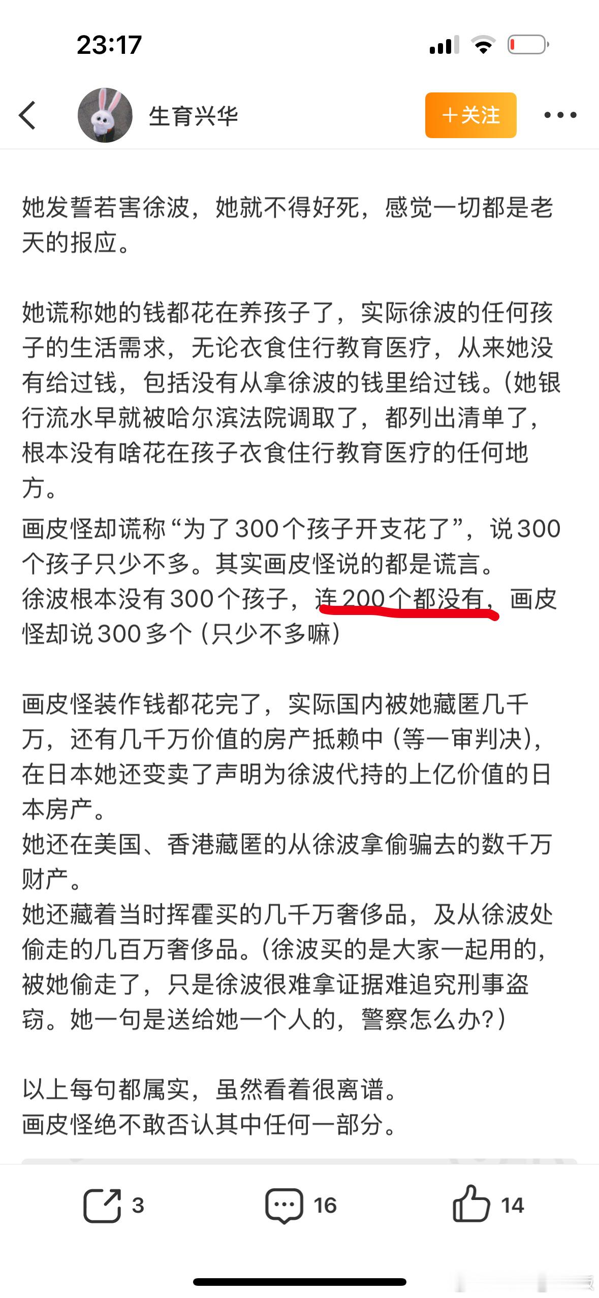 我靠我都躺下了,有人喊我起来看新出的波波雄文。看了两眼,又是头皮发麻。给大家简单划一下重点:1、之前有人在我评论区提问,几百个孩子,如果悄无声息亖了一两个是不是也没人知道?徐波刚才亲自给出了答案:是的。咱也不知道那个孩子是什么原因导致的死亡。咱只知道徐波还是拿网友都当傻子,坚称孩子是二妞妈一个人造出来的,责任也是二妞妈一个人的是不是二妞妈的血脉根本不重要。反正锅就是要扣给她的2、徐波说自己的孩子不到200个。意思就是他承认了有100多个。且不谈因照顾不周而导致的孩子严重身心问题。目前已知的信息是有意外死亡的案例。我想请问徐老板。三位数。这不是养猪。是什么。一条人命,因你的偏执来到这世上。无人好好照顾。然后无声无息就死了。这不是虐童。是什么???