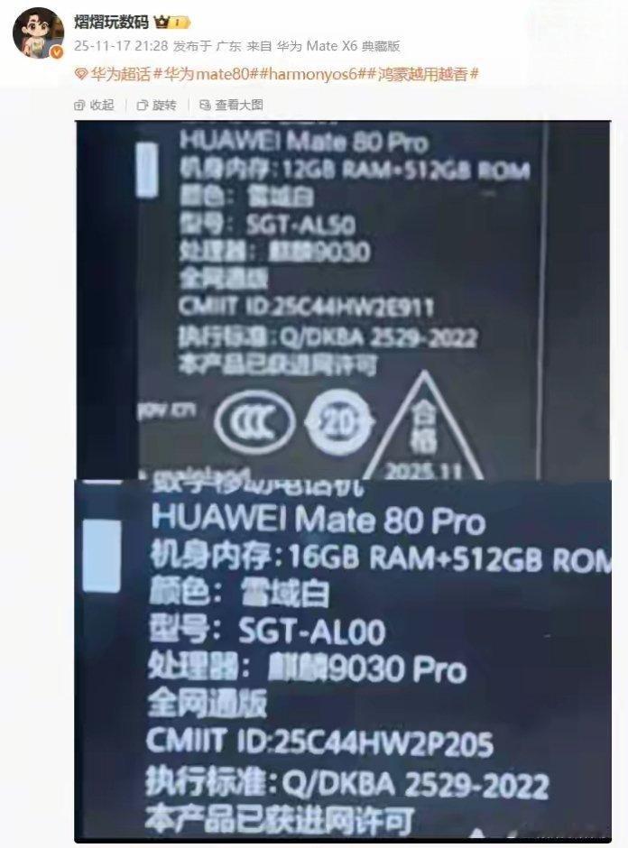 【麒麟9030 Pro处理器!华为Mate 80 Pro手机包装盒曝光】华为 Mate 80 系列手机(标准版、Pro 版、Pro Max 版、RS 非凡大师版四款机型)今日官宣亮相,将于 11 月 25 日 14:30 正式发布。博主 数码闲聊站分享了华为 Mate 80 Pro 系列手机的包装盒,新机 12GB 运存版本(型号 SGT-AL50)与 16GB 运存版本(型号 SGT-AL00)的处理器略有差异,分别搭载麒麟 9030 和麒麟 9030 Pro 处理器。另外,有消息称麒麟 9030 的晶体管密度胜过台积电 3nm。