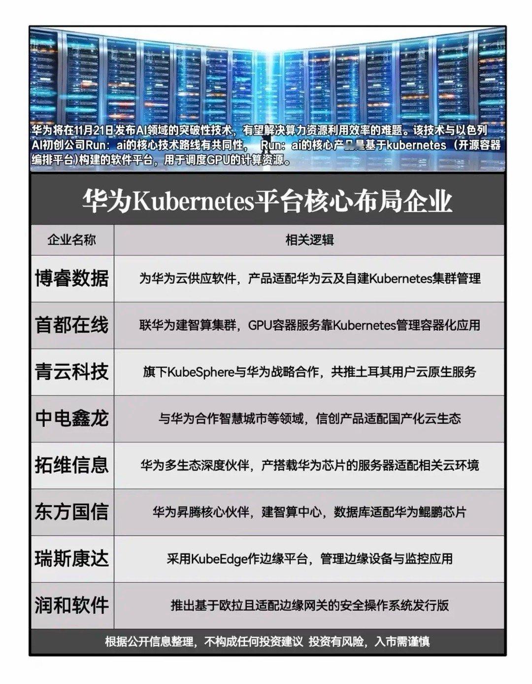 华为Kubernetes平台核心布局企业!华为将在11月21日发布AI领域的突破性技术,有望解决算力资源利用效率的难题。该技术与以色列AI初创公司Run:ai的核心技术路线有共同性,Run: ai的核心产品是基于kubernetes(开源容器编排平台)构建的软件平台,用于调度GPU的计算资源。