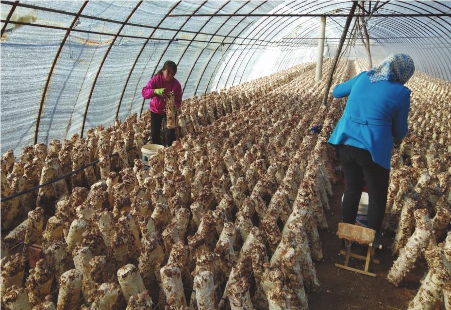 凌源市刀尔登镇柏杖子村香菇冷棚里,村民正在采摘香菇。凌源市农业农村局供图