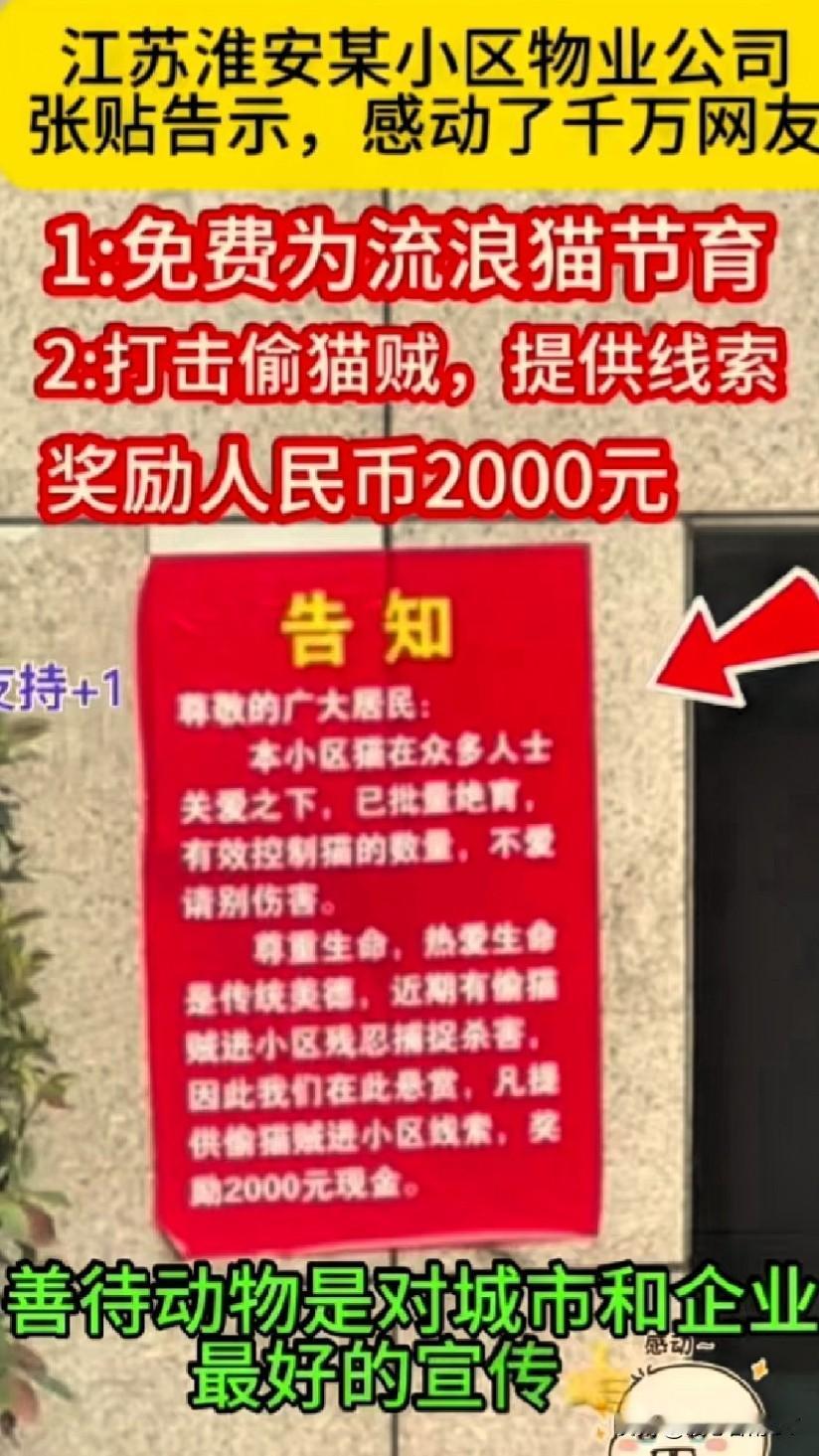江苏淮安的这家物业,把对动物的善意发挥到了极致! 江苏淮安某小区物业张贴的告示,温暖人心!不仅免费为流浪猫实施节育手术,还悬赏2000元征集偷猫贼的线索。 爱护动物从不是小事,这是对生命的敬畏,更是城市温度的体现。 愿每一个生命都能被温柔相待,这样的善意之举值得全国的物业借鉴,更值得我们每个人点赞、转发! 爱护动物,就是守护我们生活的美好底色。