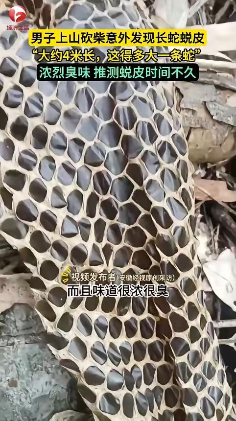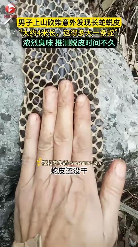 “活久见!”近日,广西河池,一男子上山砍柴时,突然闻到周围有一股恶臭味,他仔细寻找一番,竟找到一张4米长的蛇皮!男子壮着胆子上手摸了下,发现蛇皮还没有干,估计蛇刚离开没多久。网友:看着像是眼镜王蛇! 蛇皮摊在草丛,黑褐色像粗带子,鳞片湿润,最大的有巴掌大,黏着泥土草屑。男子摸起来粗糙发凉,恶臭味混着腐叶腥气,展开比扁担还长,原主体型让人发怵。 河池多山多林,喀斯特地貌适合野生动物生存,蛇类有上百种,毒蛇占比不低。但网友凭蛇皮就定是眼镜王蛇,太武断。眼镜王蛇颈背有人字形斑纹、头顶有特殊枕鳞,视频里根本看不清这些细节。当地之前还出现过80斤网纹蟒,4米长的蛇皮也可能是它的。 男子上手摸蛇皮的操作极危险。眼镜王蛇剧毒,单次排毒量超三百毫克,被咬后易呼吸衰竭。蛇皮没干,说明蛇离开时间短,大概率还在附近休息。山里老人说“见皮不摸”,这是经过验证的生存经验,不是迷信。 蛇蜕皮是正常生长,能摆脱旧鳞片、甩掉寄生虫。现在生态环境改善,野生动物活动范围扩大,山里遇到蛇或蛇皮的概率变高。眼镜王蛇是国家二级保护动物,伤害它违法,近距离接触也会给自身带来风险。 这张4米长的蛇皮真的是眼镜王蛇的吗?在山里遇到没干的蛇皮,你会靠近查看还是立刻躲开? 评论区分享你的看法和应对办法!