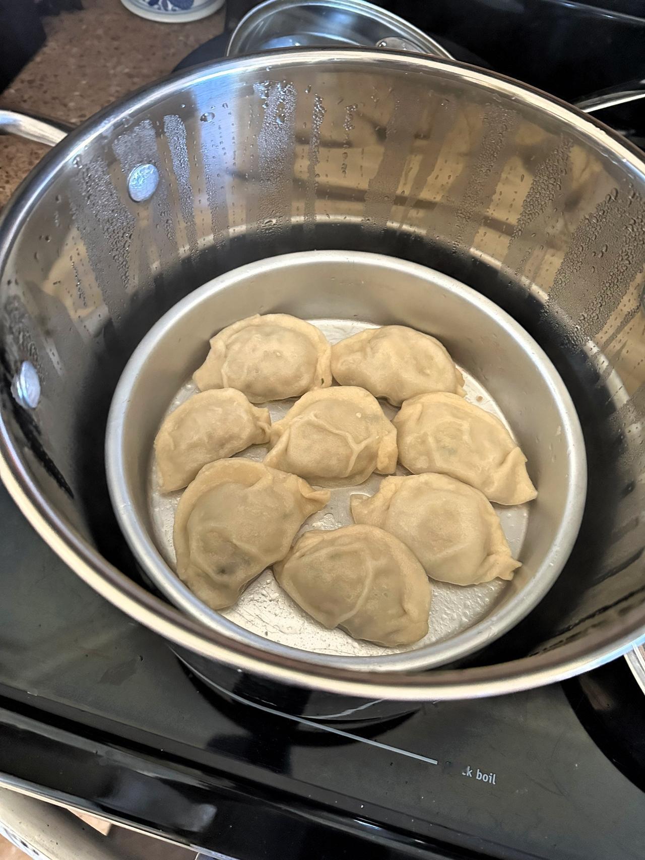 山药饺子馅真好吃🥟:第一次做山药鸡肉猪肉虾胡萝卜韭菜馅蒸饺,饺子皮面粉加一点木