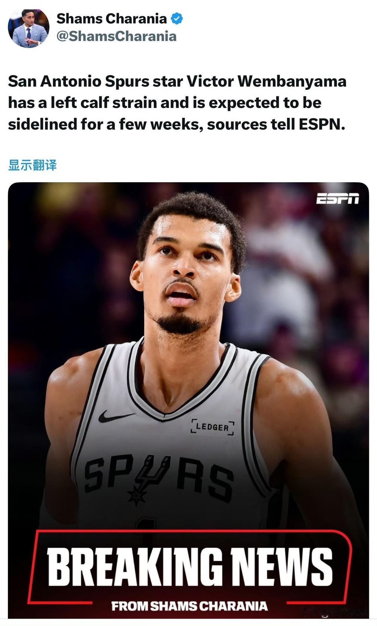 打完勇士队就受伤了! 今天,据权威记者Shams报道:马刺队当家球星文班亚马遭遇了左小腿拉伤,预计将缺席数周的比赛。 文班亚马是在11月15日对阵勇士队时遭遇的受伤,他被倒地的波杰姆斯基压到了小腿,又被格林踢到了大腿,本场比赛过后便高挂免战牌。随着进一步的检查结果出炉,文班亚马确定了腿部拉伤,需要长时间的休养。这样一来,马刺队的战绩压力巨大,他们目前以9胜4负排名西部第五位,有掉出西部前六的风险。